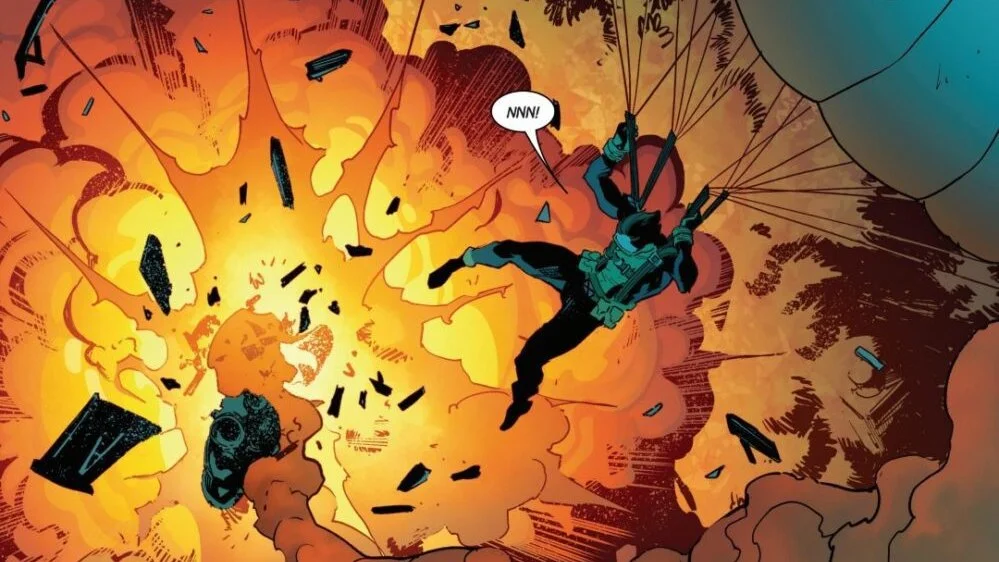 Cyclops narrowly avoids death as he shoots off a parachute to bring him to safety. Unfortunately the Quinjet is destroyed in the explosion and Cyclops' luck keeps running out as flames from the jet spark up towards his parachute, leading him to collapse down into the trees. On the way day, he wacks his head on a branch, leaving him unconscious while he calls out for Jean.