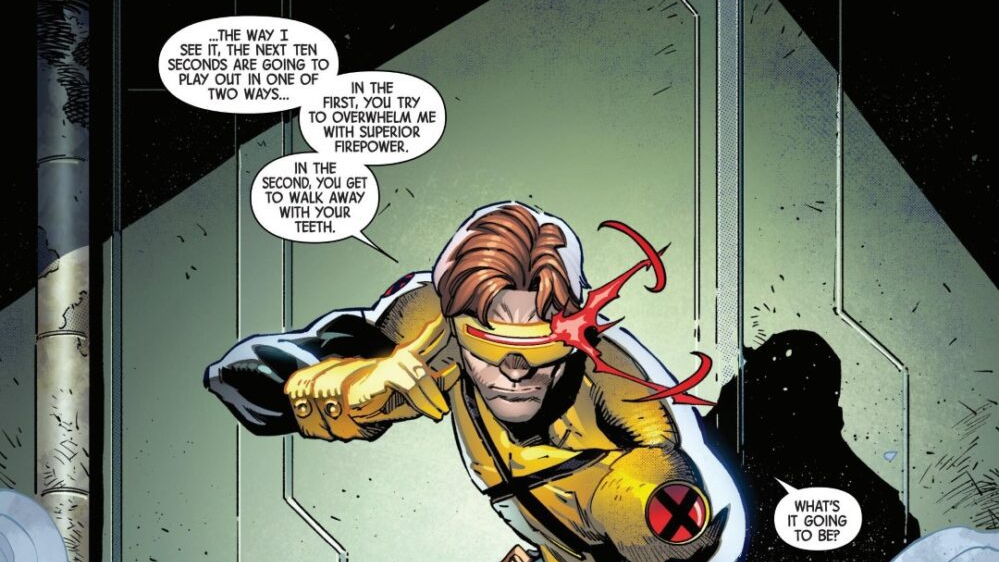 With the X-Men under attack at A.I.M's facility, Quentin and Magik are looking to be in dire need of help, and that help arrives in the form of a confident Scott Summers. He gives these A.I.M soldiers two options, eithee let his team go, or get their teeth knocked out. These soldiers aren't very bright as they lunge on their attack to Cyclops.