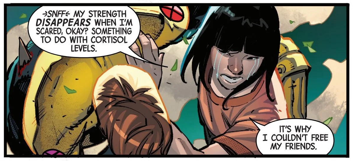 Endzone falls off the cliff they were battling on. Leading Cyclops to question Mei on why she didn't use her strength to help Cyclops. She tells him that in high stress situations, her powers won't work due to her Cortisol levels. Nonetheless their journey continues.