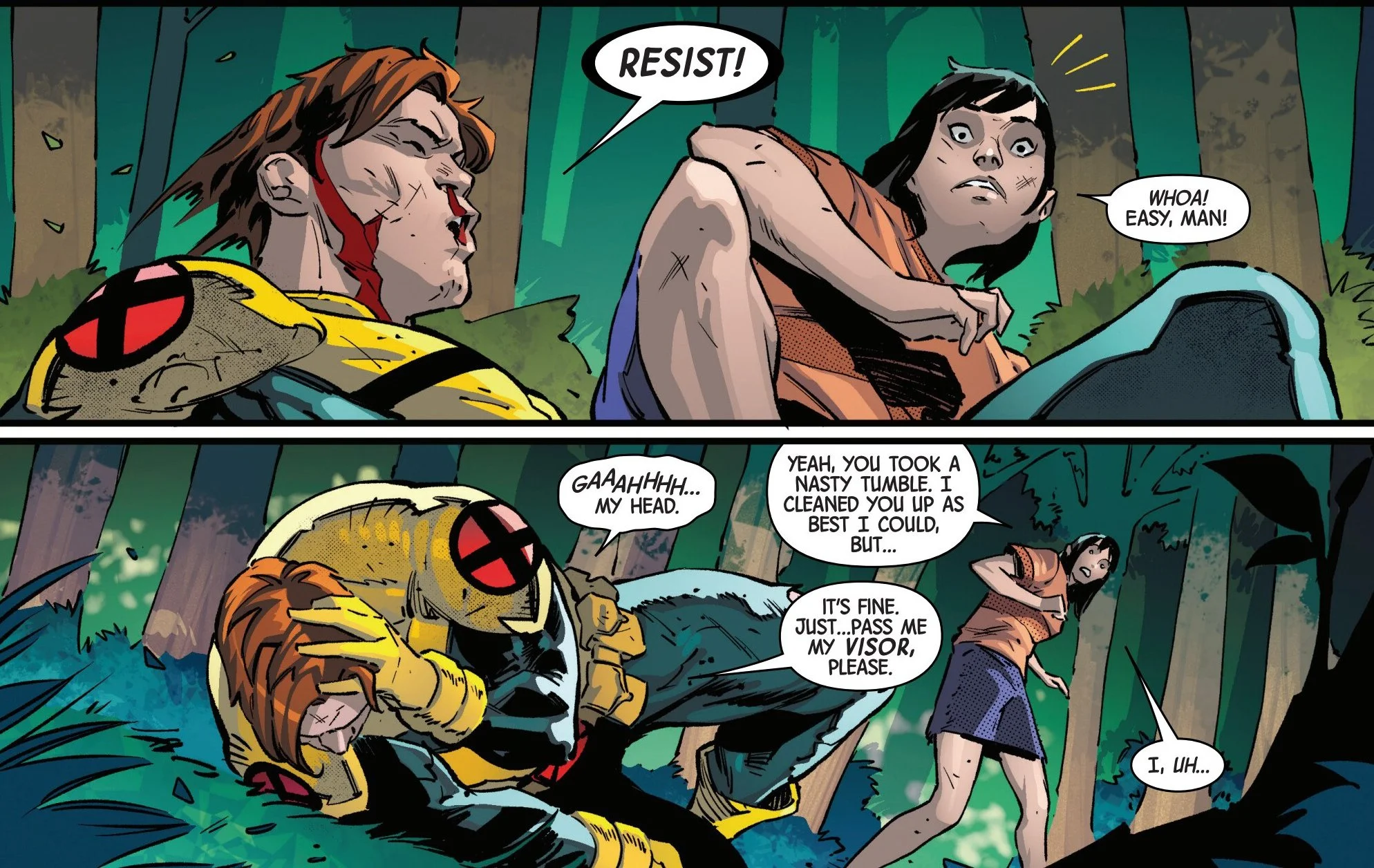 Cyclops wakes up from a nightmare. In doing so he startles Mei who found him in the woods. After he demands for his visor, she tells him that she physically can't give it to him due to the visor being destroyed in his fall.