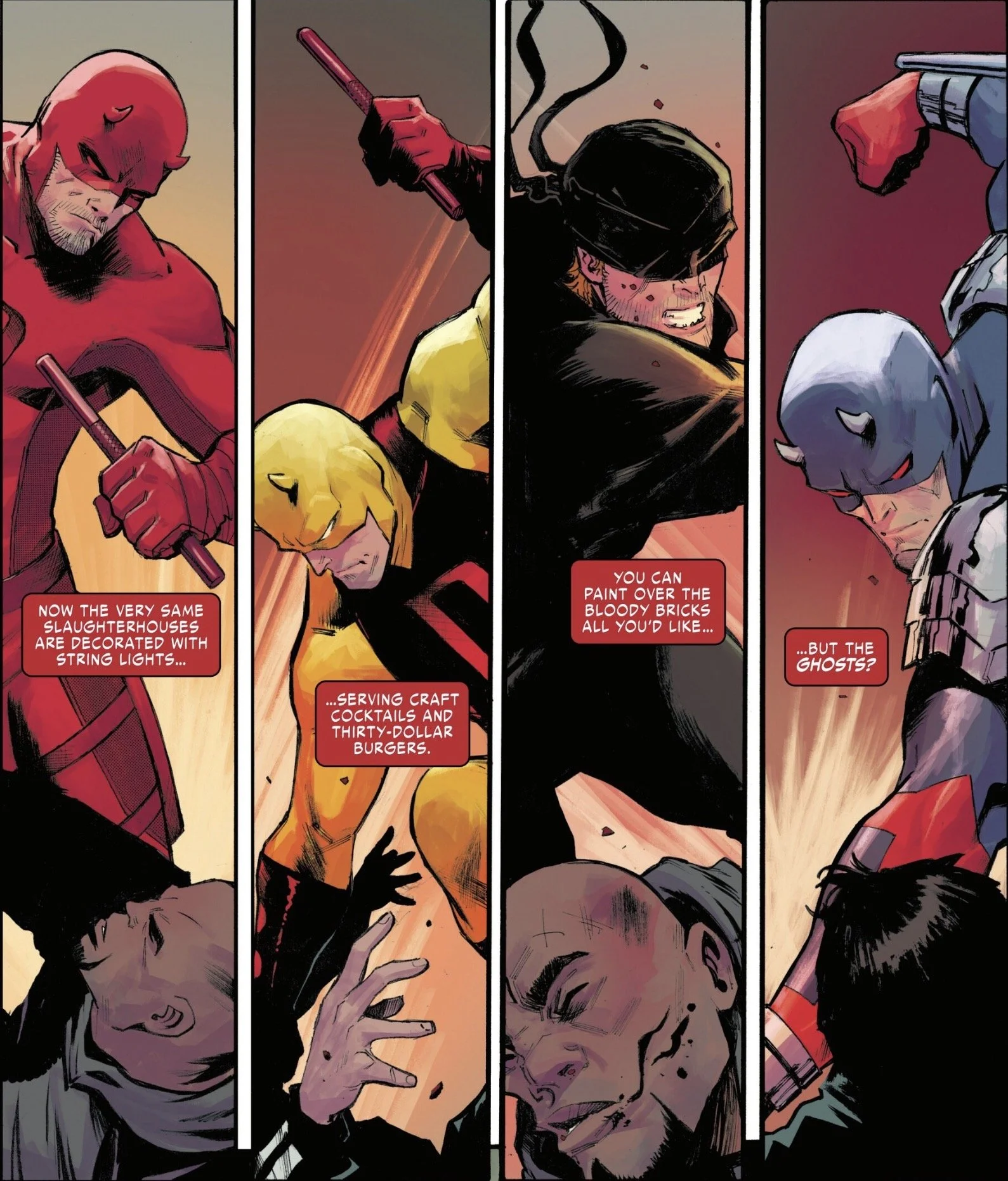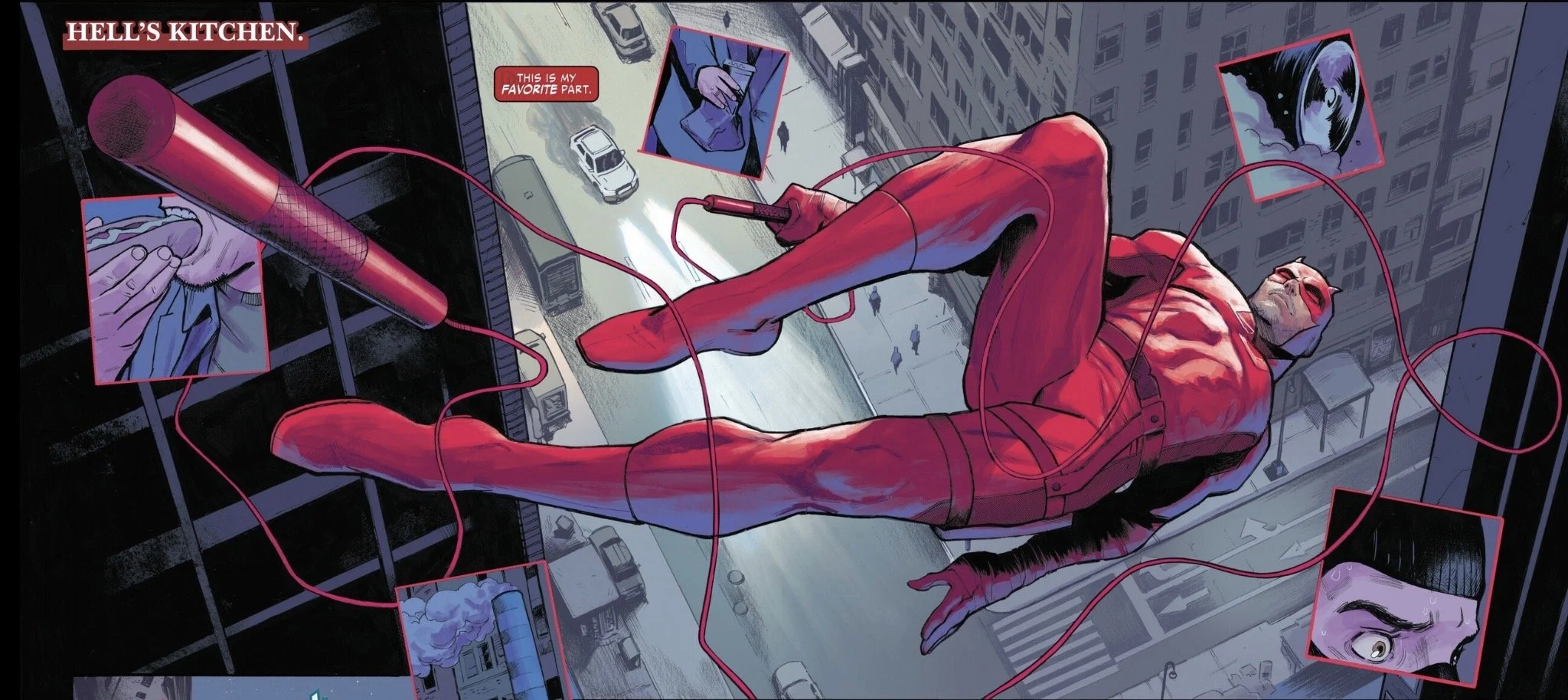 After bidding his friend good night, Matt heads back out into the city as Daredevil. He comes across a mugging in an alley and handles it with minimal effort. As he works, he reflects on Hell’s Kitchen over the years and his place within it. It’s not always the safest neighborhood, but it’s his home.