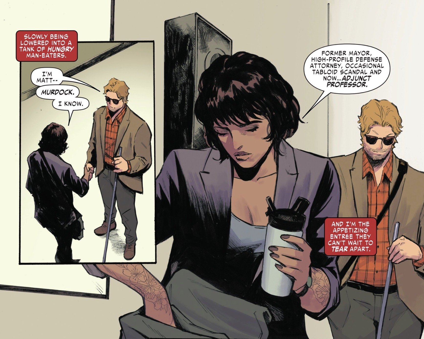 Next, we get a look at Matt Murdock’s new job: teaching a Contracts class at Empire State University. He feels like he’s in over his head, but overall, it seems to be going well. A little after-class flirting with the Ethics professor who follows his class shows that while the career may be new, the rizz is the same as ever. Boy, I hope she has beneficiaries set for her life insurance.