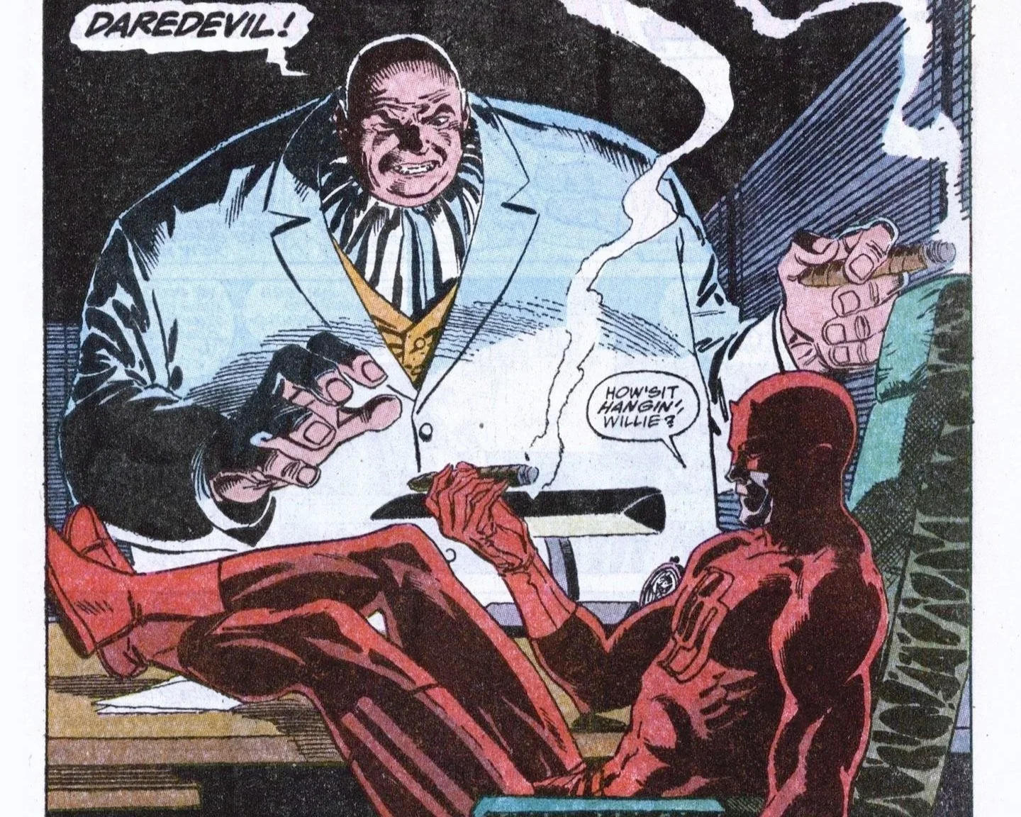 Matthew Murdock is in court, defending a two-time loser who’s on trial for a third strike that he didn’t actually commit. While Matt is making his case, the narration recaps the origins of Daredevil and the core dichotomy of his character - lawyer who believes in the law, and red-clad vigilante who believes in justice. Matt wins his case, but the victory is quickly drowned out by breaking news: Wilson Fisk, the Kingpin of Crime, is dead. And the prime suspect is Frank Castle, the Punisher.