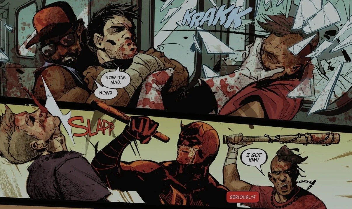 As Daredevil makes his way across town for a meeting with Misty Knight, the beaten and bloodied Punisher (in full gear, no less) is catching a ride on a subway train where a group of thugs decides it would be a good idea to pick a fight with him. As luck would have it, soon both of our leads find themselves in the same place at the same time, and some of that “crowd-pleasing, gritty violence” mentioned earlier ensues...
