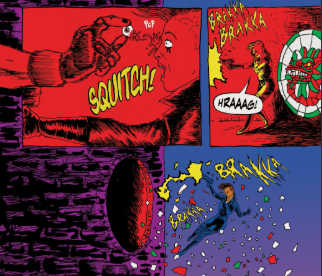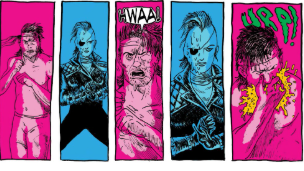 To me, the monocoloring from panel to panel adds character to Death Fight Forever as a whole and gives the book a cooler tone. In contrast, the first issue used different, brighter colors and looked lively. This issue, however, feels like 'angrily drinking in a dingy bar with the neon light buzzing off and on,' which gives it an '80s retro feeling that fits the story well. The art for Death Fight Forever #2 was great.