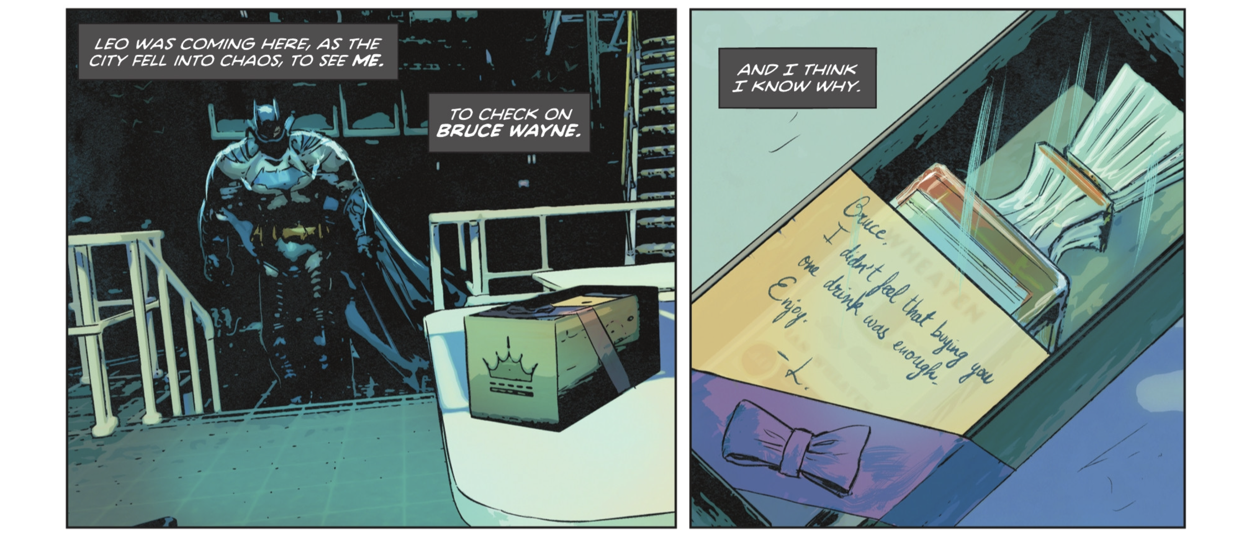 Batman proves to be the King of The Lion after outsmarting him in the eleventh hour, but this was only a short-term fix. The most brilliant bit of writing in Detective Comics #1106 comes when Taylor recalls the gift Bruce received from a stranger, a drink from Bruce’s meeting with Leo Kingsford. It was great, because once that was mentioned, it clicked for me as a reader, I felt like I had figured out, along with Batman, that type of reader engagement was a great touch to this finale.