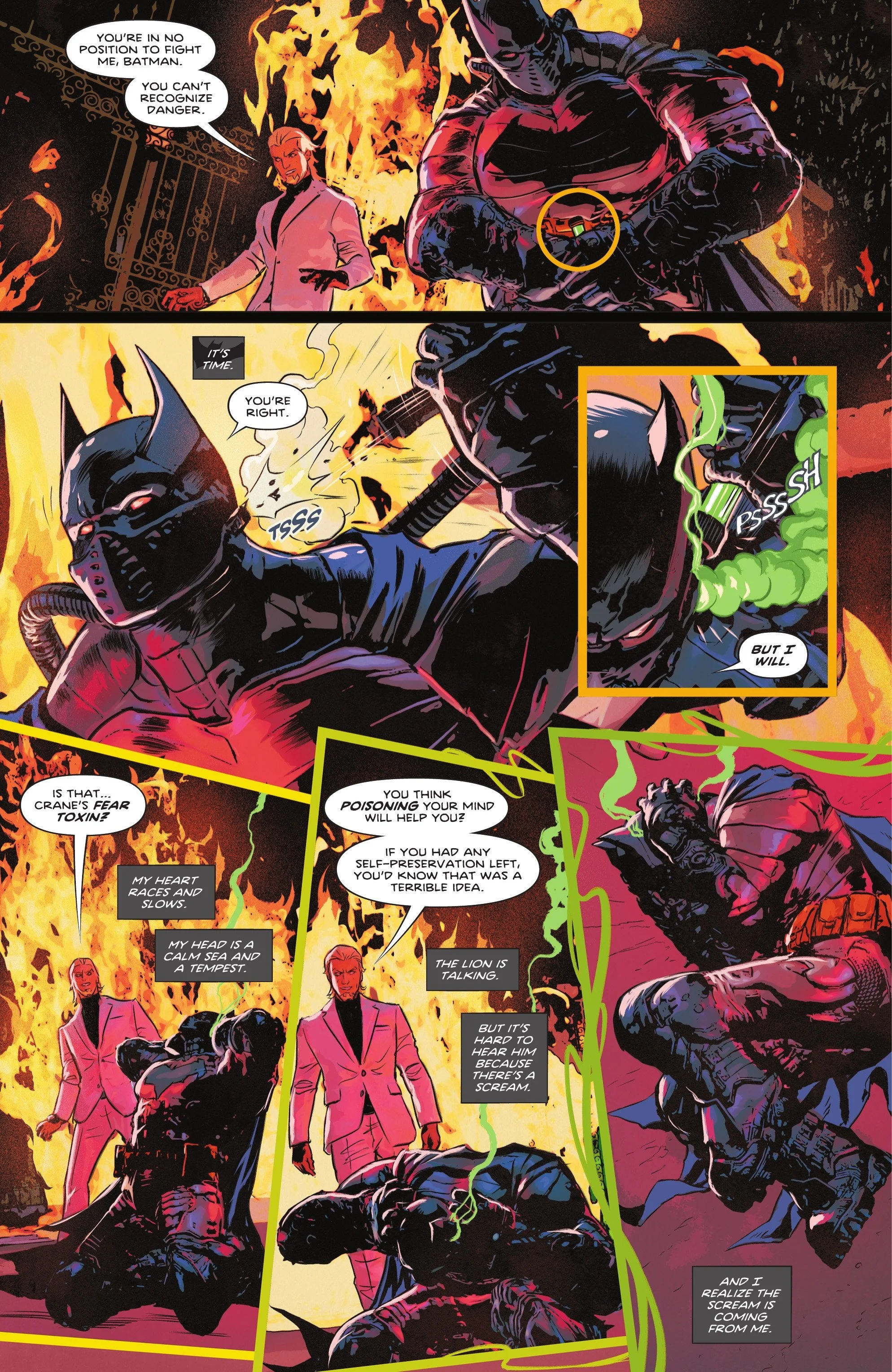 Detective Comics #1106 gave me as the reader everything I wanted from the finale: rage, resolution, and reflection. Taylor once again nails the pacing in Detective Comics #1106 right from the off—he shows us the benefits and drawbacks of having courage, which was cleverly presented as opposed to having no fear. It really started the issue off by making me think about that aspect, as I’m pondering over that, Taylor expertly takes the pace up a gear—Batman combats the Courage Killing virus with Scarecrow’s Fear Toxin.