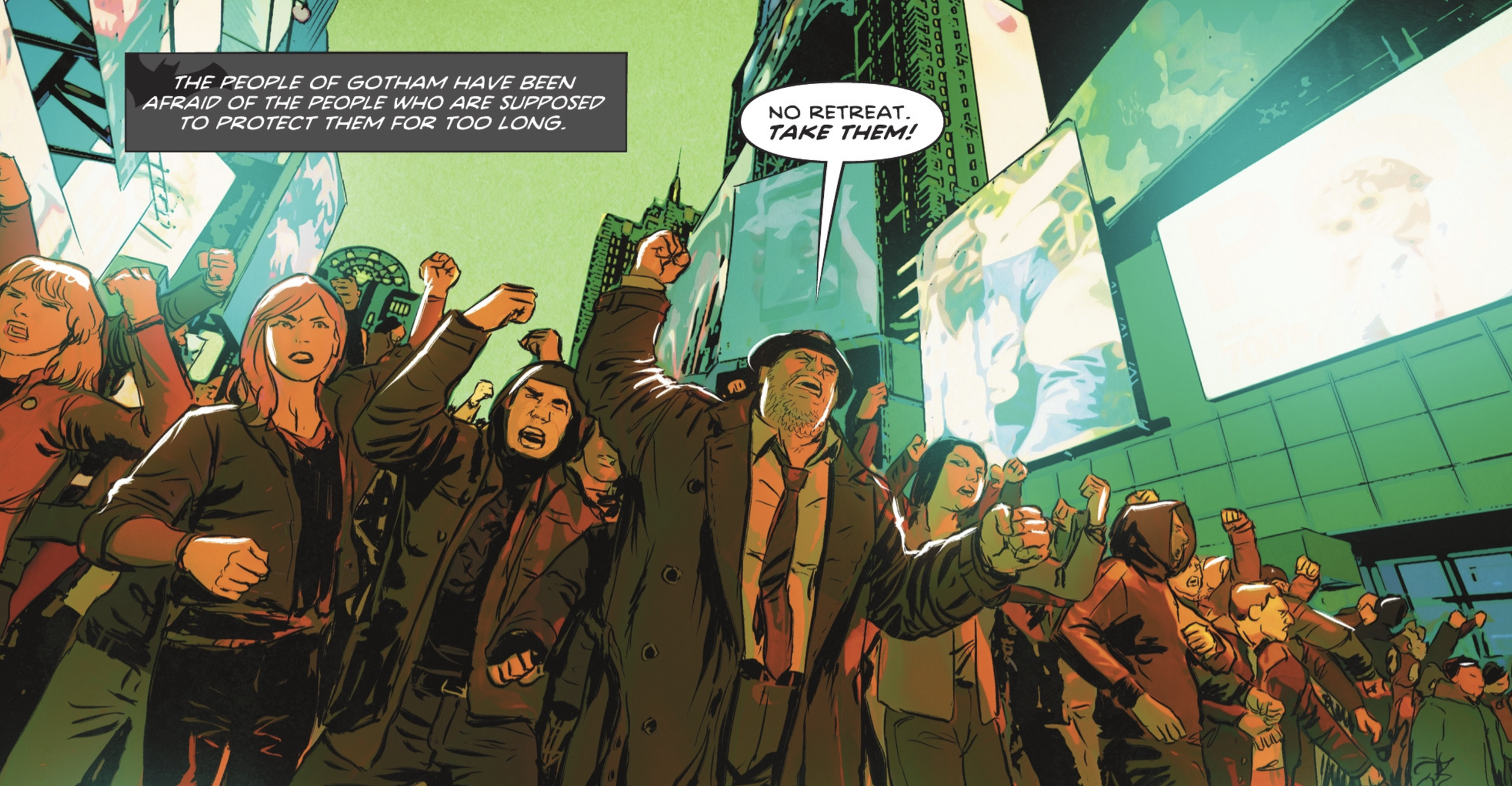 What was fitting from Taylor’s writing is that the first thing Bruce did now that he’s thinking straight again, is to check on his son, Damian; showing that even though with all of this craziness going on around him, it was his son’s wellbeing that was on his mind. Now there is a massive catastrophe waiting to happen, Gothamites revolting against the police establishment for treating the populous poorly, and an evil commissioner in Savage, who’s ordered his officers to stop the revolt with any means necessary. This further established the effect of the Fear Killing virus, as police officers were ready to shoot civilians on sight.