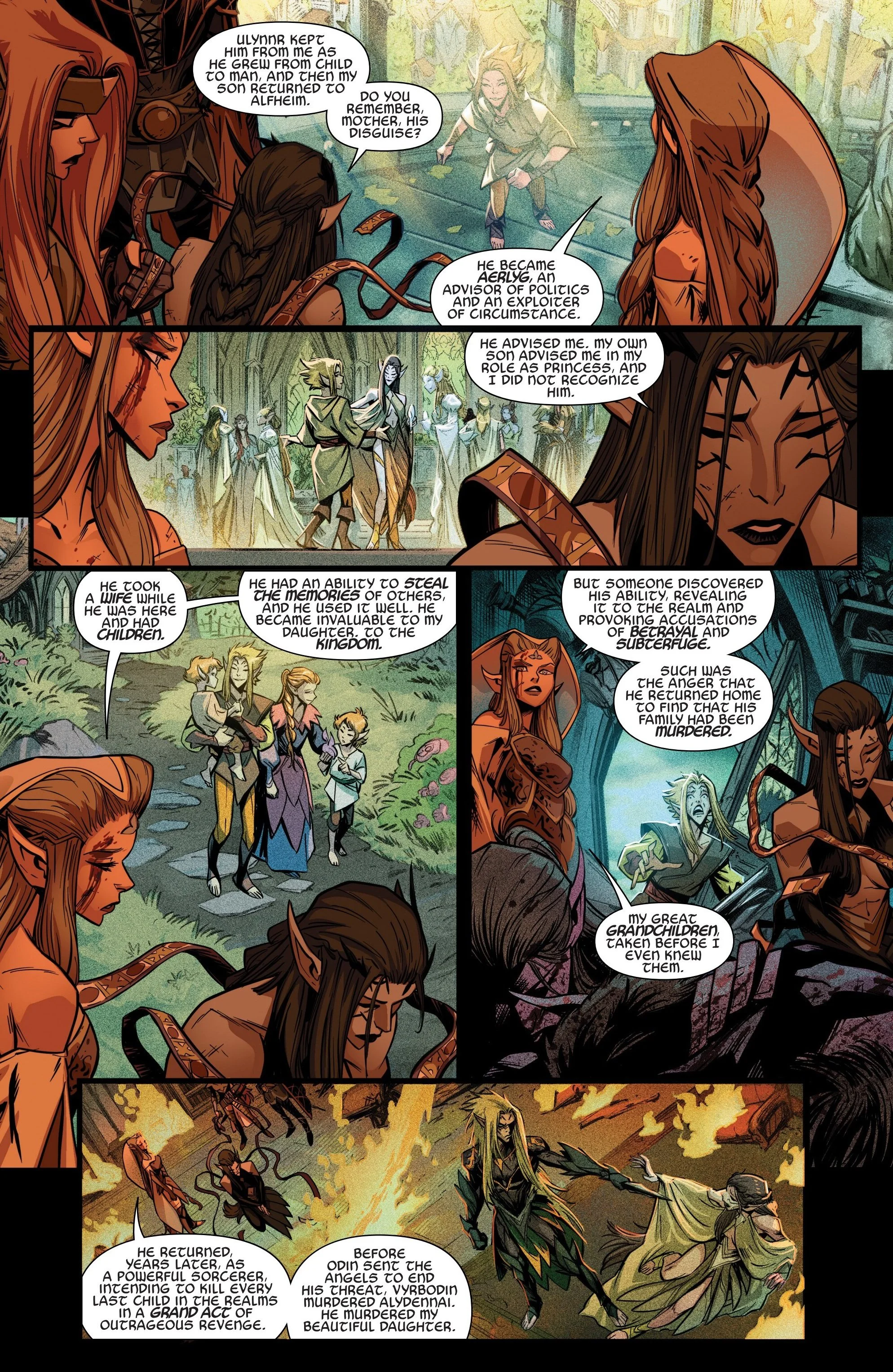 The most amazing piece of art is where Fiorelli draws Vyrbodin’s turn of fate, from happy elf to murderer. Two panels side-by-side show him walking happily with his family down a path. The panel adjacent shows the horror on his face as he discovers his wife and children murdered. The five-panel page did a tremendous job in slowly pacing me, as a reader, to the eventual acknowledgment and enlightenment of the scenario that turned Vyrbodin into what he has become today.