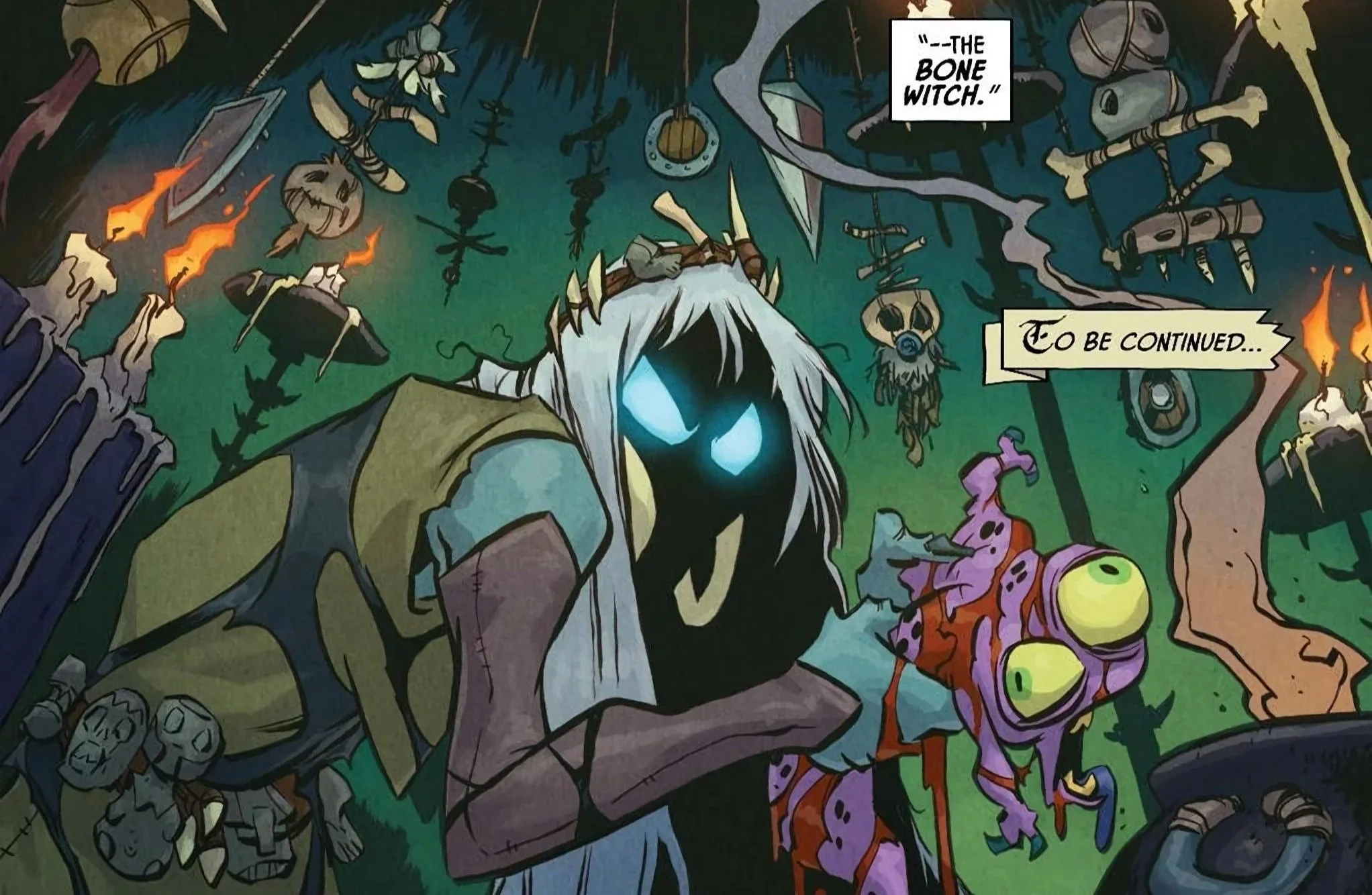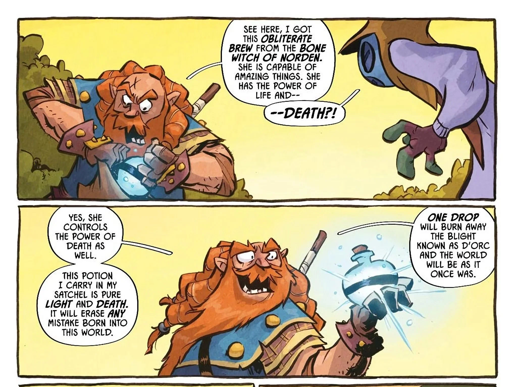 D’Orc, realizing how much he sometimes hates this world, gathers his allies and marches off towards the Bone Witch in the hopes of not just putting Chicken’s body back together but also to ask her to stop making death potions designed to destroy him. The trio of misfits outlines their grueling journey as they march off towards the infamous Bone Witch, as our comic comes to an end with a rather ominous image of the mysterious character in question within the heart of her grim lair.