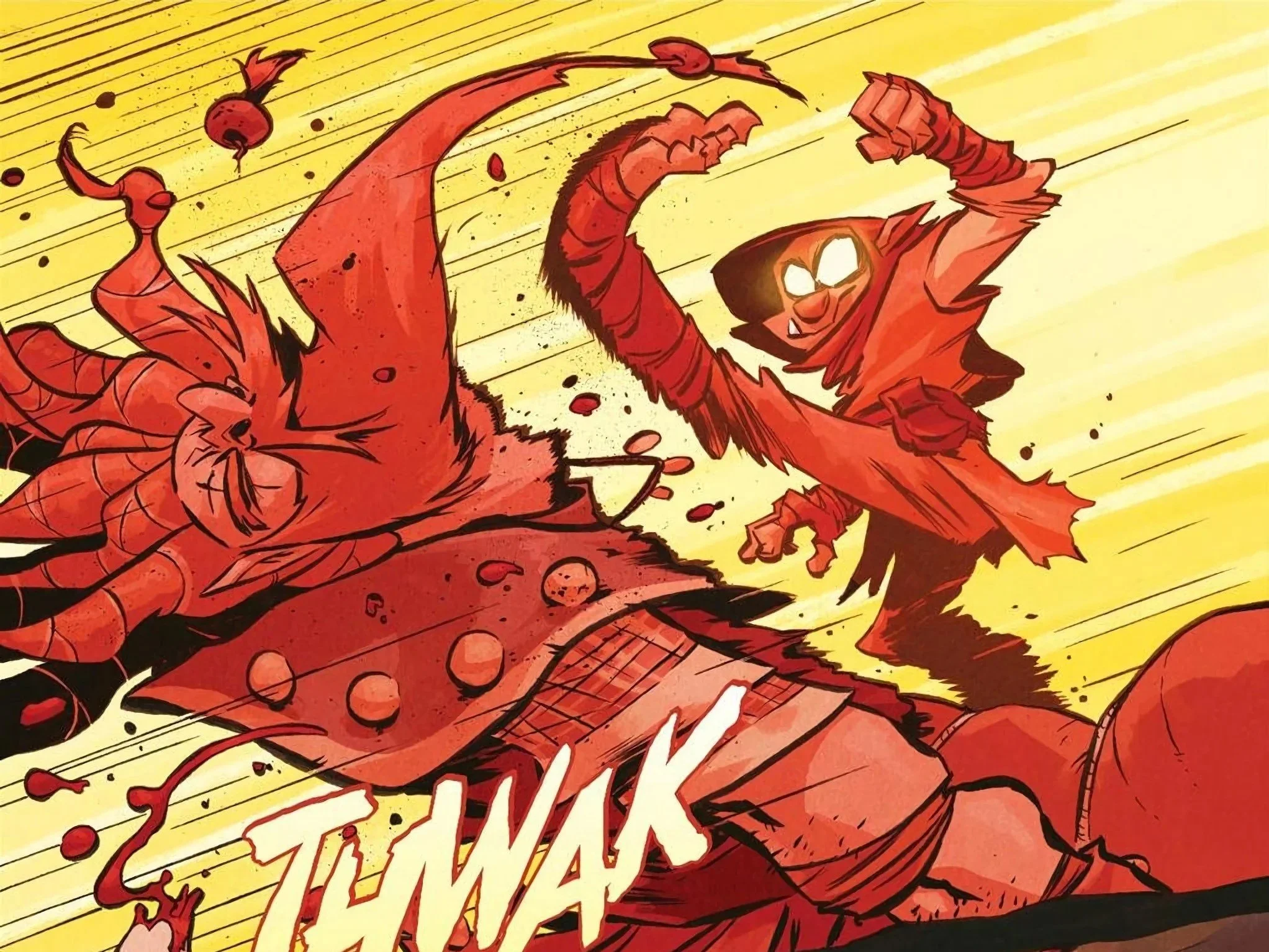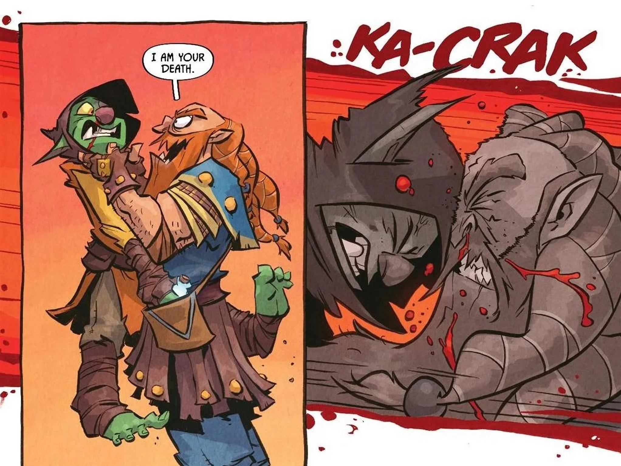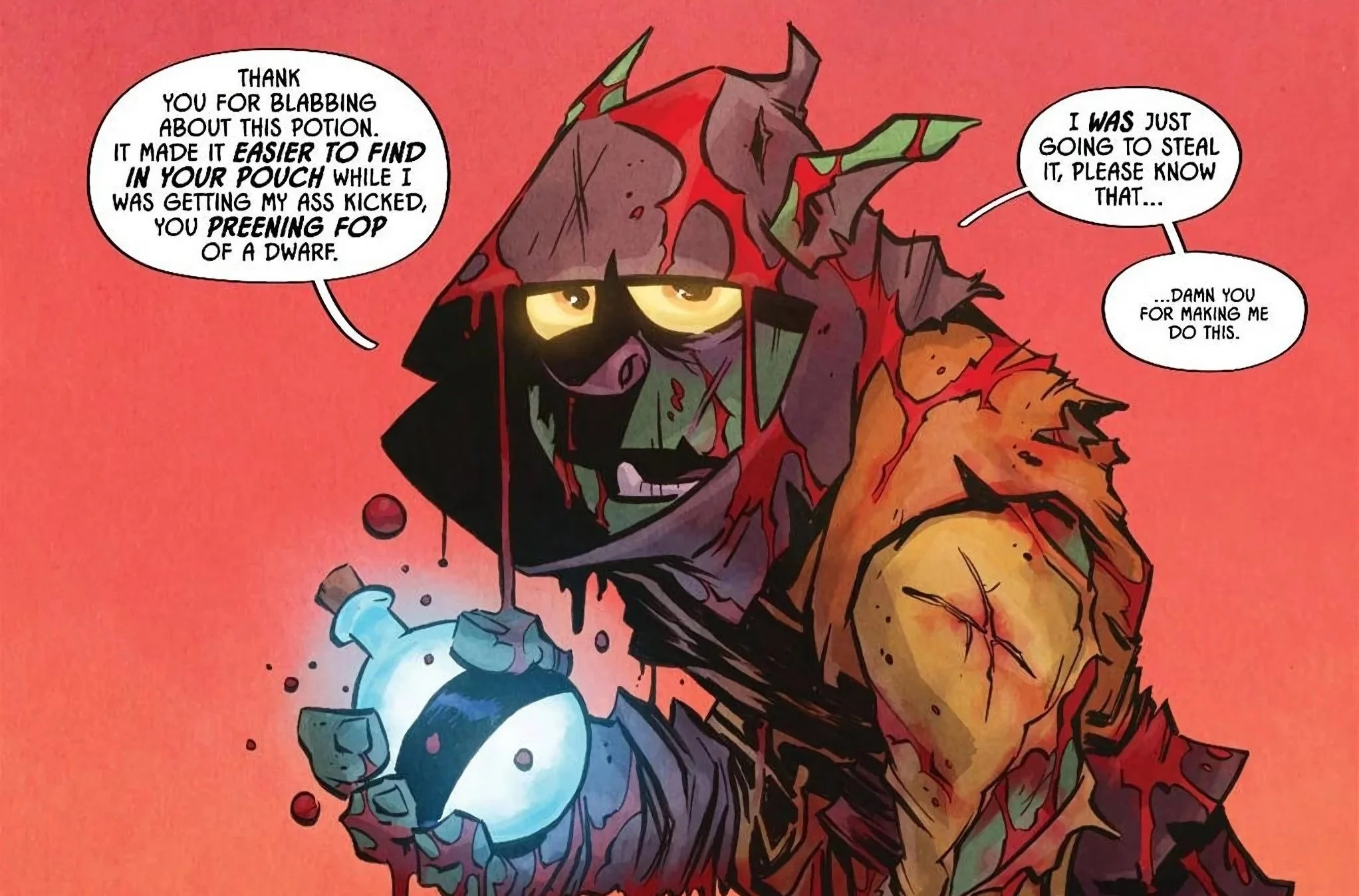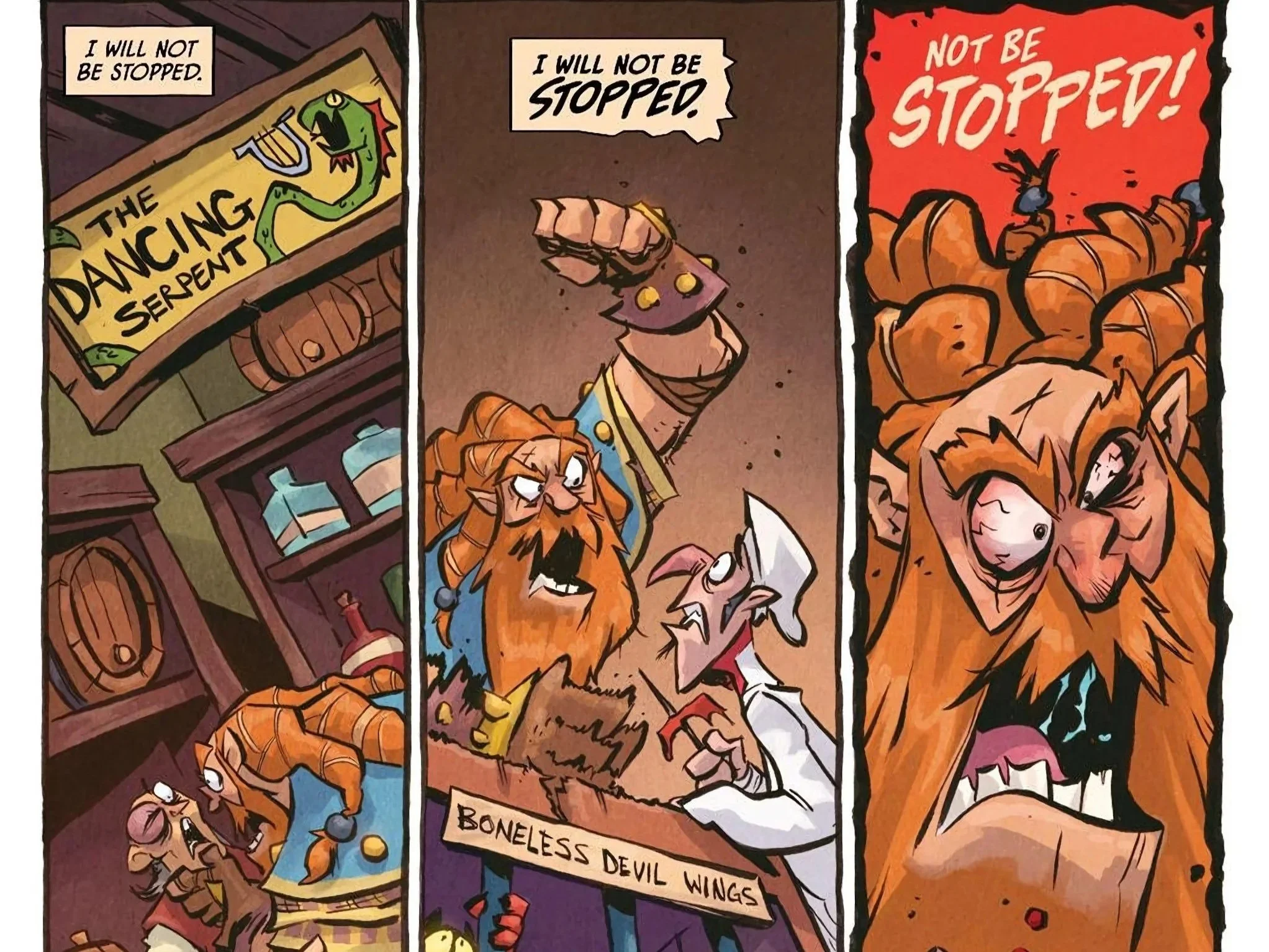 Bean’s art here, colored by Jean-Francois Beaulieu, balances expressive, dynamic characters with explosive, at times comical brutality. I legitimately don’t think this book would be the same, let alone as good, without its art, and it’s a core reason as to why the series works. I also appreciate how the background shifts colors when things get really serious, going from the bright and colorful scenes we’ve grown accustomed to to the darker, brooding red. The ultra-violent action is a hallmark of the series, but the issue knows how to play with expectations, and it never feels like a gimmick. I actually felt a real sense of danger for D’Orc during his battle with Gloinspear, even if the ending was telegraphed pages in advance, and the level of detail is impeccable. Every blood splatter and gruesome-looking injury tells a story in and of itself, and it’s visually very striking. The tavern sequence with Gloinspear repeatedly shouting “I will not be stopped!” as he goes more and more into a fanatical rage, only to admit “I am stopped,” is the kind of hilarious pacing and artistic storytelling that make this book a delight.