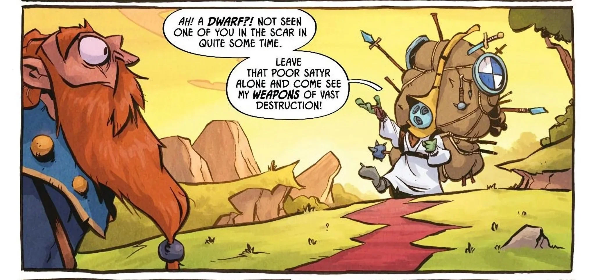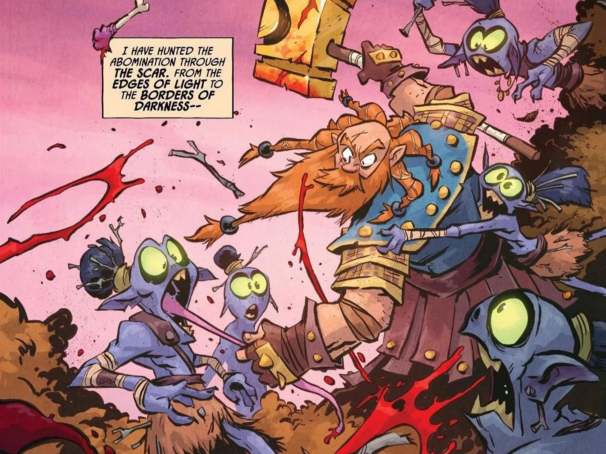 Our story begins as we focus on Gloinspear, the hand-picked champion of Light who was chosen to vanquish the abomination known as the D’Orc with extreme prejudice. We waste exactly zero time as we see this dwarf begin slaughtering dark wood elves, making it very clear that nothing and no one will stand in his way. He picks up on D’Orc’s trail, as the narration makes it clear that not only does he find the titular character distasteful, but his seemingly random acts of kindness through the Scar as well. Every act of generosity or aid that D’Orc gives is quickly undone by the fanatical dwarf as he trails him down, stomping on spiders whom the former has helped or ripping out the horn from a satyr that D’Orc gave freely.