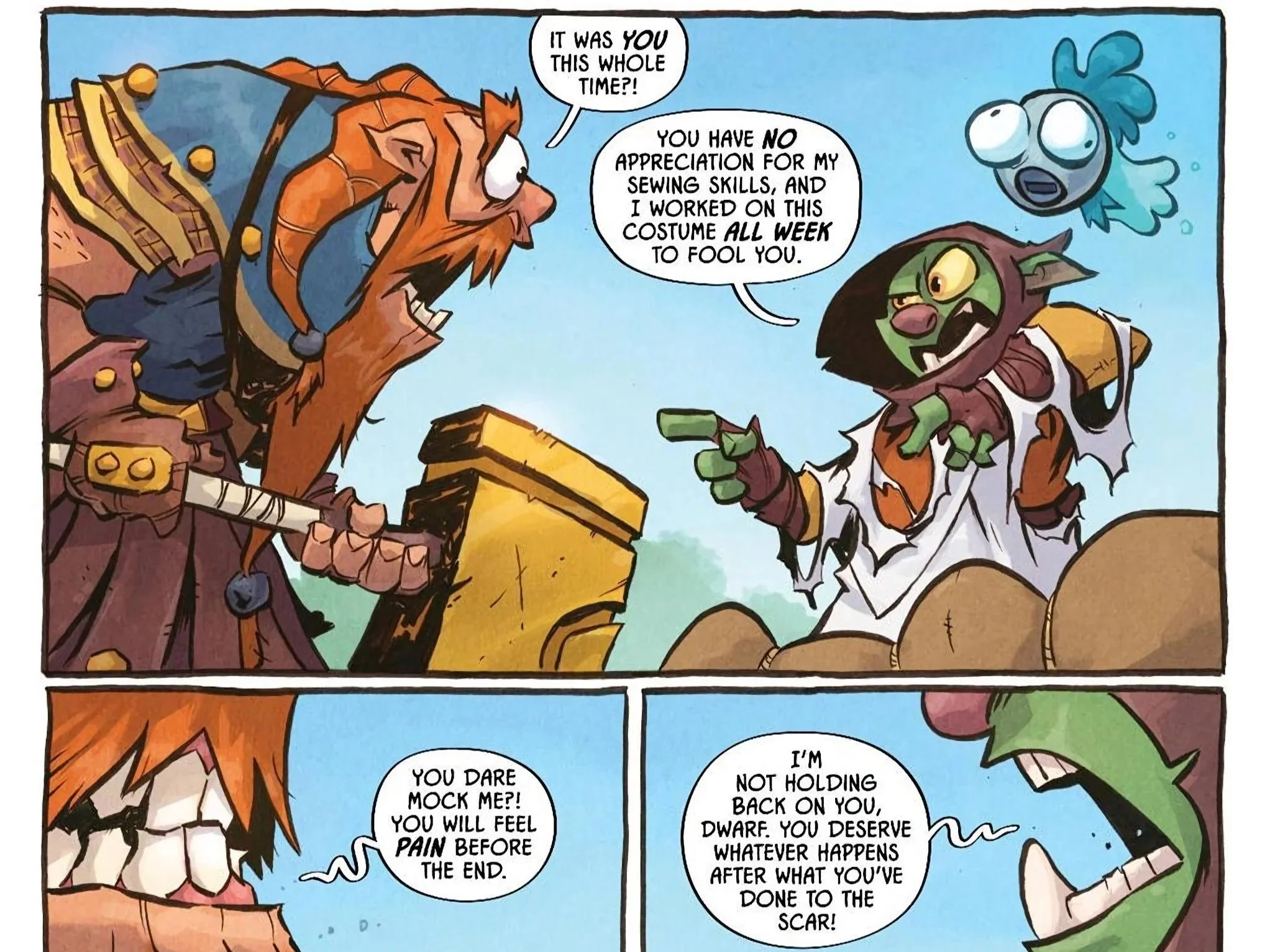 The two trade pointed words with one another as D’Orc mentions it took him a week to come up with the costume before they exchange furious blows. For a moment, it looks like D’Orc has the advantage as he kicks Gloinspear hard and far enough to send him almost over the edge of a cliff. Almost. Gloinspear then proceeds to brutalize D’Orc, shrugging off a possession attempt from the ghostly Chicken and even foiling a sneak attack from the magic shield! It looks as if Gloinspear is about to end D’Orc’s existence as fishes for his magical potion, but D’Orc pilfered it from him! He reluctantly informs the dwarf he never wanted to do this and only wanted to steal the potion from him before he hurls said potion at Gloinspear in a dazzling detonation of magic as the dwarf’s body plummets from the cliff.