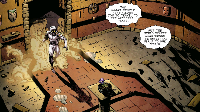 This podium stands in a room of many trinkets and items. But he only has eyes for this singular item. Its an herb that not only allows a person to travel to the ancestral plane, but allows them to bring back the dead. Including his wife that has died. He eats the herb causing a purple surge to go through his body and come out of his eyes. The door to the ancestral plane has opened.