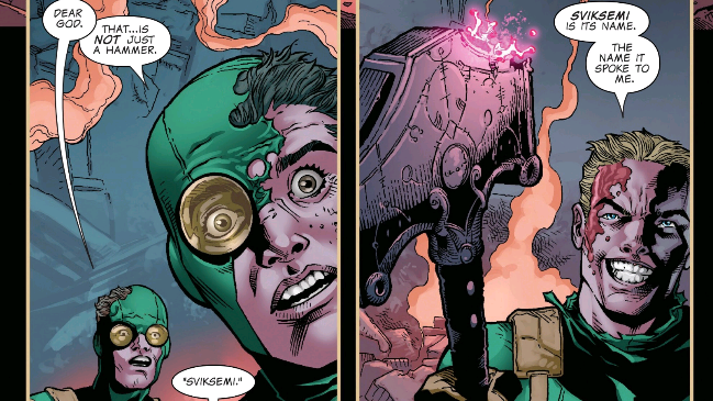 Sergeant Majors begins having mystical smoke coming from his mouth, causing his voice to change as well. While all this is happening, a dying Latverian soldier lays in the rubble, pulling his gun up and blasting some of the US soldiers away, and Red Hulk hears it all.