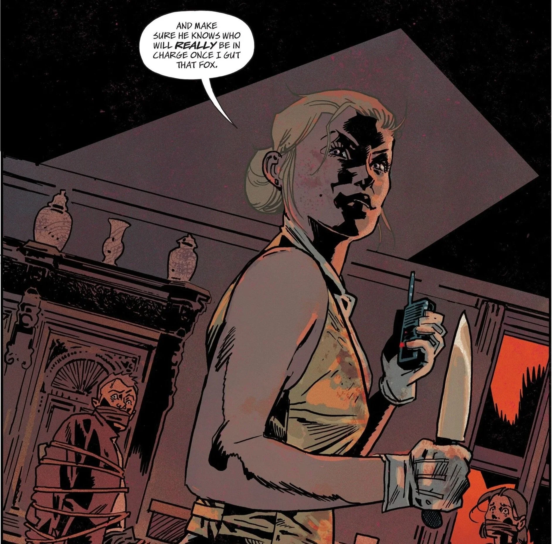 The issue closes on Lady Carolina. She does not want Massachusetts determining the next five years. Rather than relying on the weapon of the Lone Gunman, she intends to use the knife of The Congregation. However, the final image makes it clear how sinister she truly is. A family is tied up in their home. She stands over them, blade in hand.