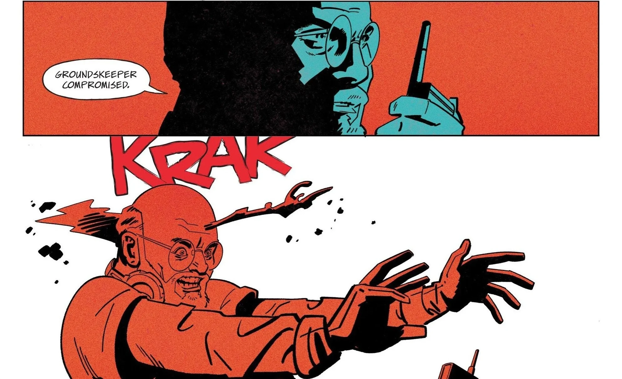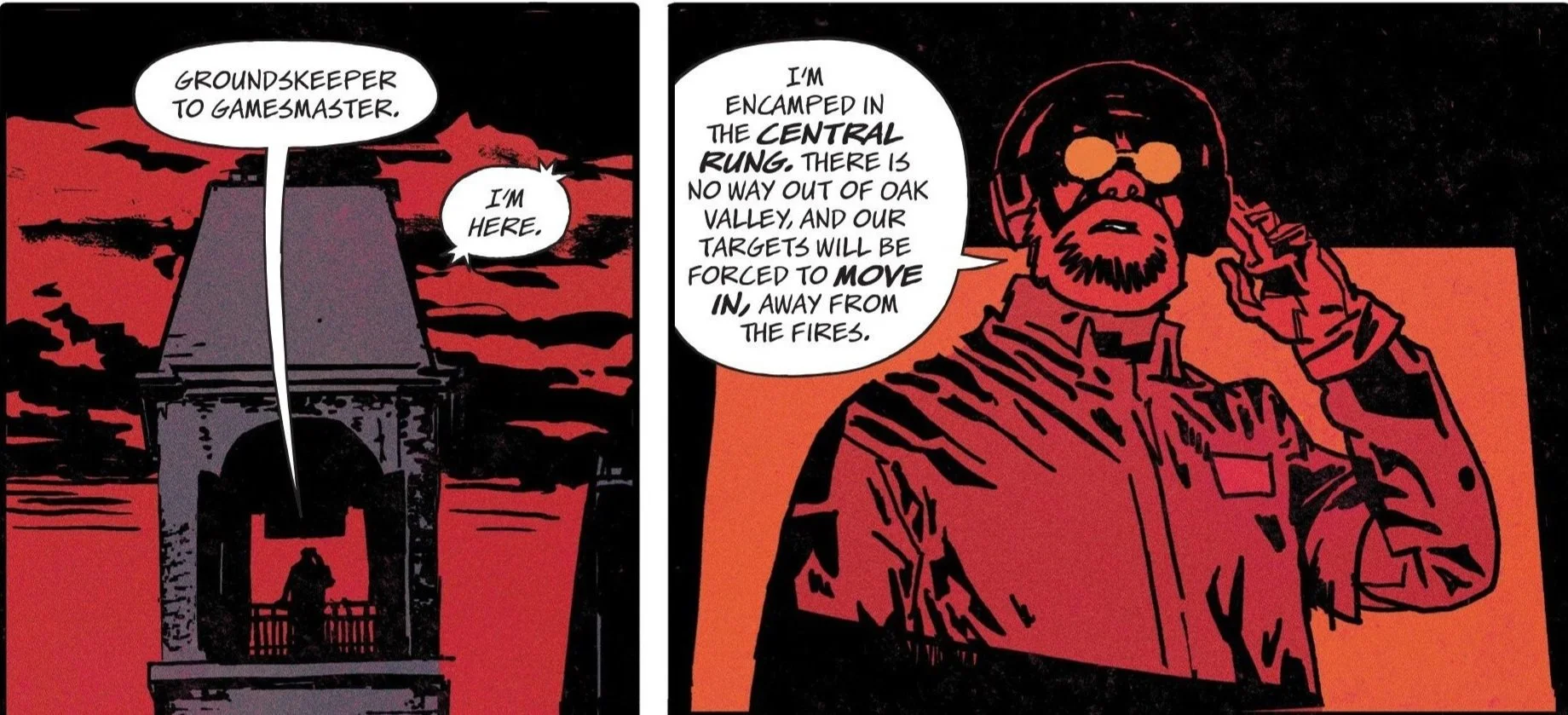 The issue opens in the church bell tower with the groundskeeper calmly discussing how the game is nearing its end. He has snipers positioned to eliminate any civilians who might witness the final confrontation. It is a chilling way to begin, not because of overt violence, but because of how procedural it feels. This is logistics. This is infrastructure. It is a system that has run long enough to account for every variable, including stray witnesses.