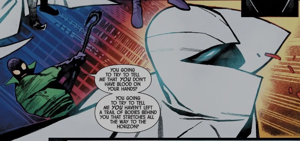 One of the things that I’ve really enjoyed about this run is how Moon Knight jumps into every situation face (and fists) first, but nine times out of ten, violence alone does not solve the problem (although it does make Marc feel pretty good). In this case, Marc throwing the possessed Wrecker into the Midnight Mission, drawing Ginnaar, and then the two of them beating the stuffing out of each other didn’t resolve the haunting; rather, what Reese and Scarlet Scarab did outside was what won the day.