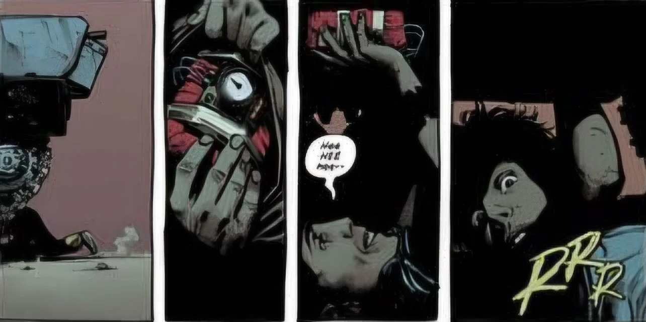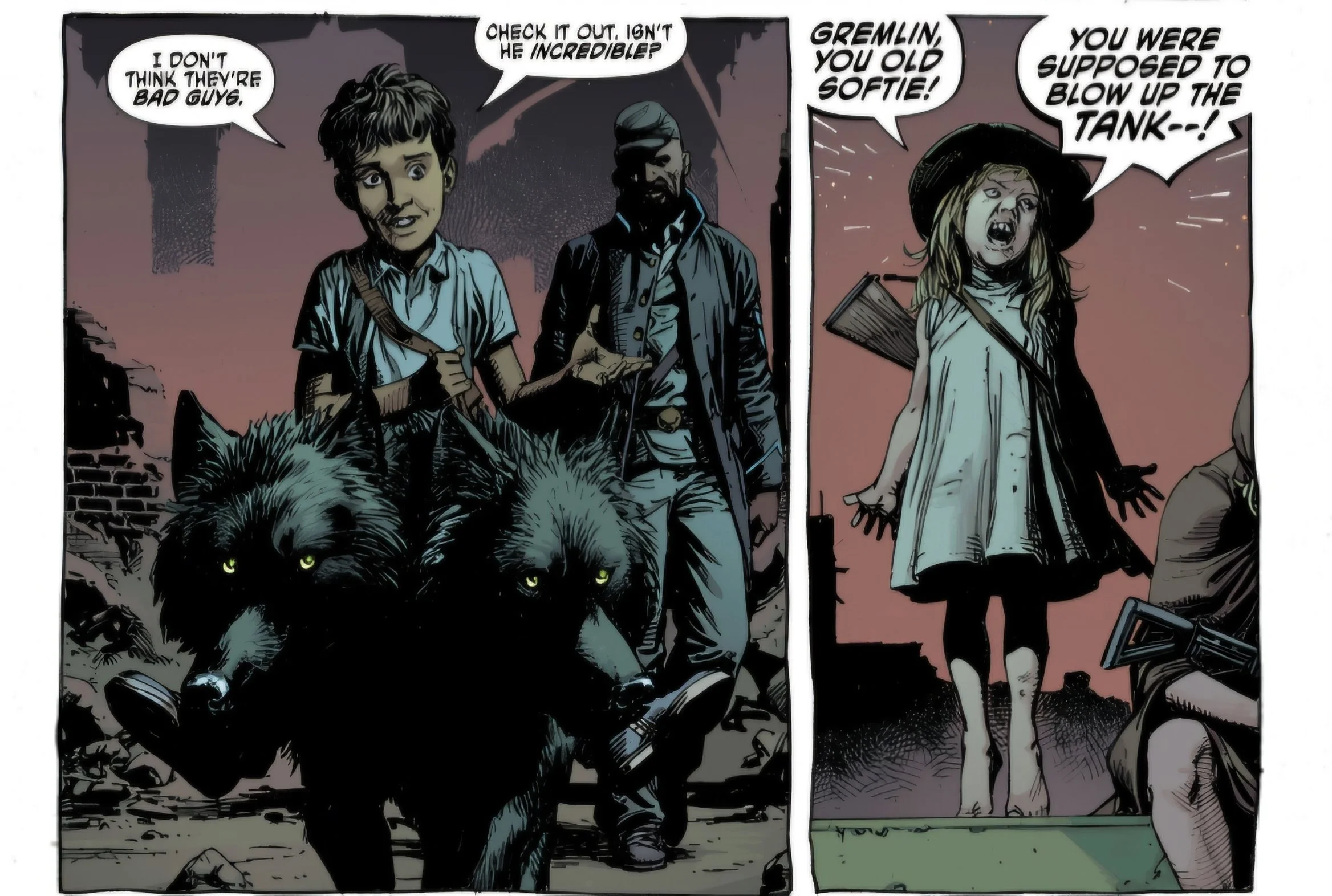 Issue #22 of Geiger picks up immediately following on from the events of the last issue, with both Tariq Geiger and the Northener finding a gang of orphans who seem to only have each other to trust and rely on. Neither party initially trusts the other when first meeting, but over the course of the issue, they grow to learn from each other and we even find some of Tariq Geiger’s prickly edges get worn away by the children as he is reminded of his own children, who are some of the numerous people he has lost in the war.