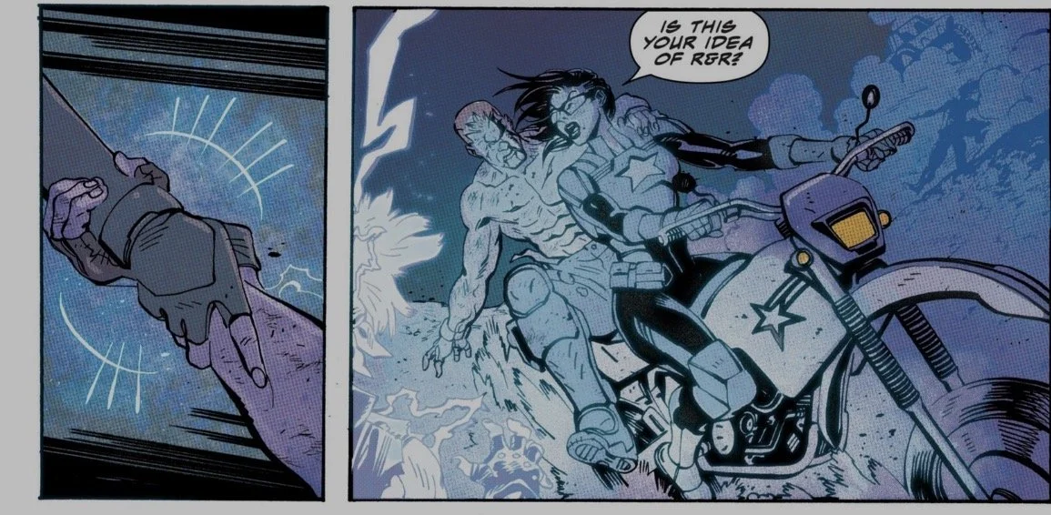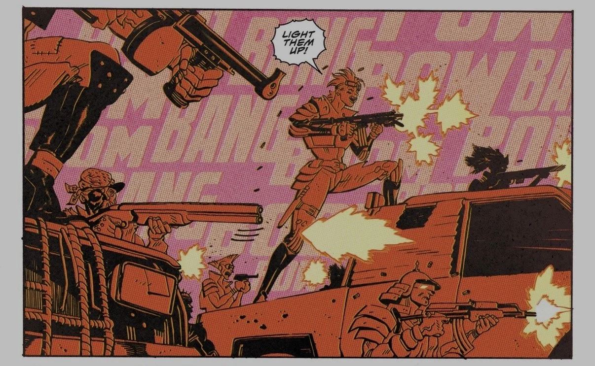 Now for the colors—I want to talk about this a bit. Jordie Bellaire is the colorist, and the coloring is my single biggest issue with this series as a whole. Let me start by saying that I absolutely applaud innovation and trying new things; the last thing I want is more stagnation in comics. But... that doesn’t mean everything always works. This series leans hard into a “retro” aesthetic—early issues had the Ben-Day dots from when old comics were printed on matrix printers. Now, the colors use different shades and effects both for atmosphere and to punctuate action.