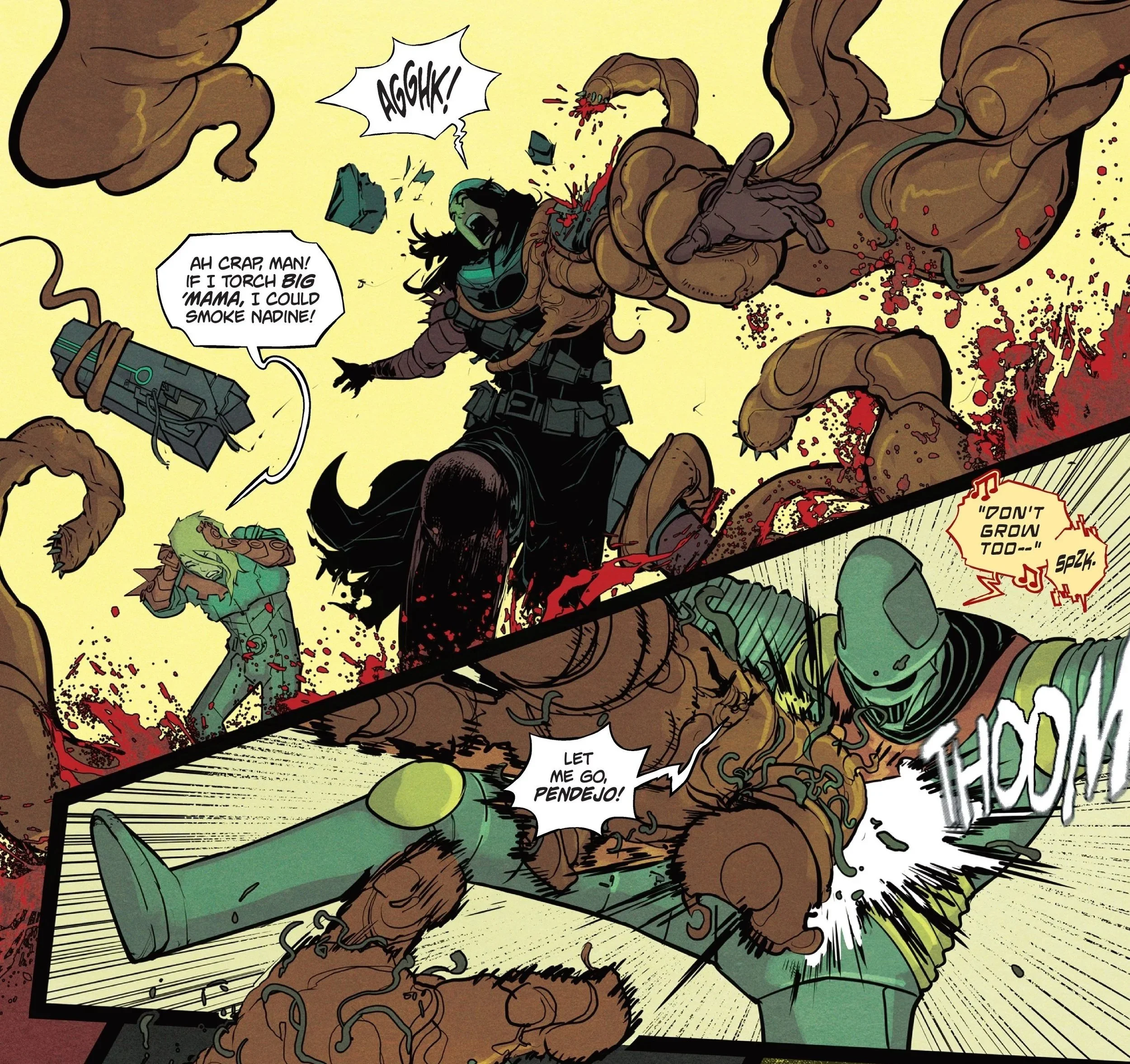 The appearance of Yacumama is easily the highlight of the issue. The creature’s parasitic design, unsettling physiology, and aggressive behavior immediately stand out. Its appearance brings a dose of tension and unpredictability the series has needed since the start. Yacumama feels like a genuine threat, and its scenes finally deliver some of the horror and scale the book has been missing.