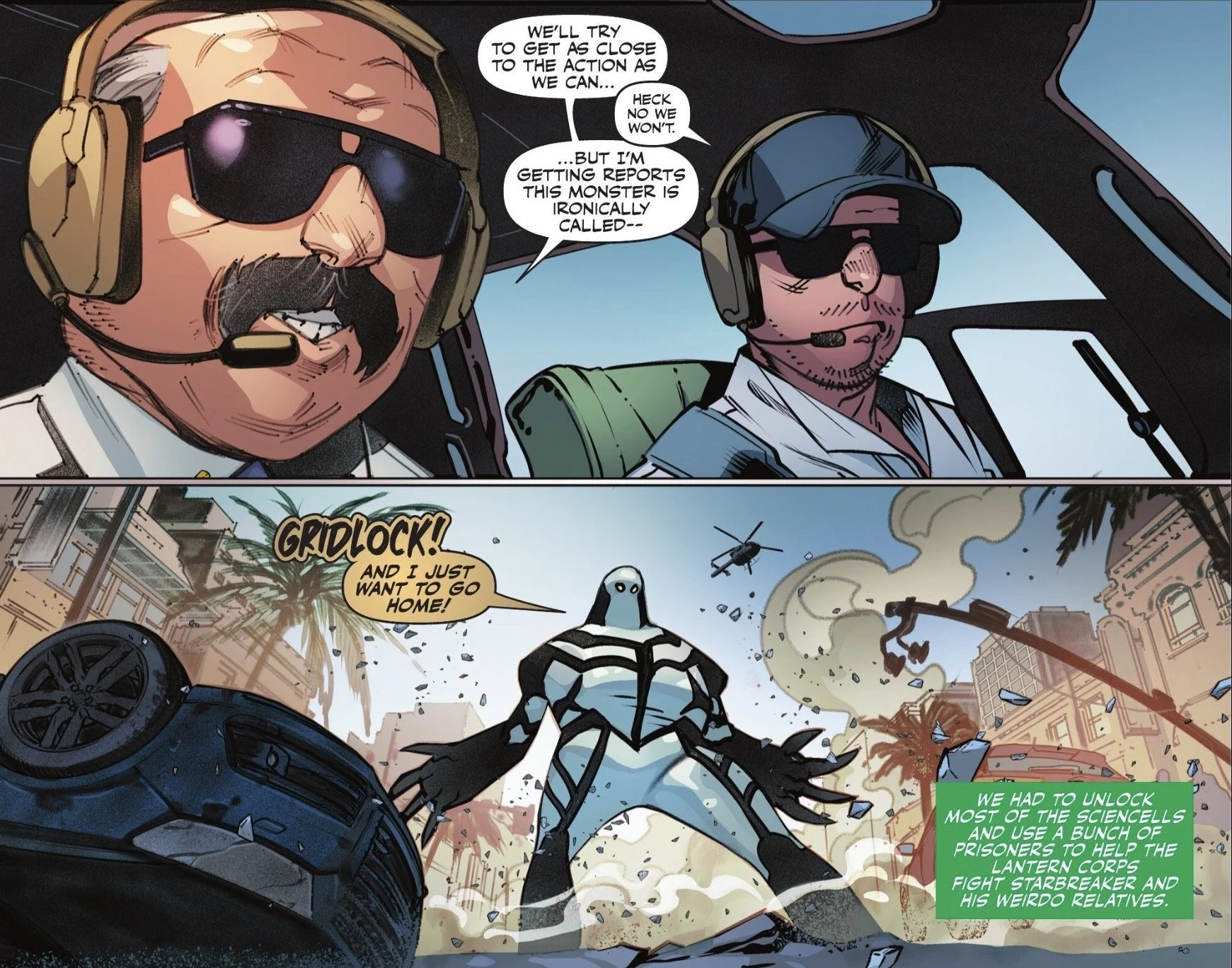 Fortunately, Green Lantern (the Kyle Rayner one) is on the scene! Gridlock gets in a few good licks, but GL is able to win the day in the end. We get some great play-by-play commentary from a news chopper flying over the scene, and Kyle’s solution to Gridlock is both simple and satisfying.