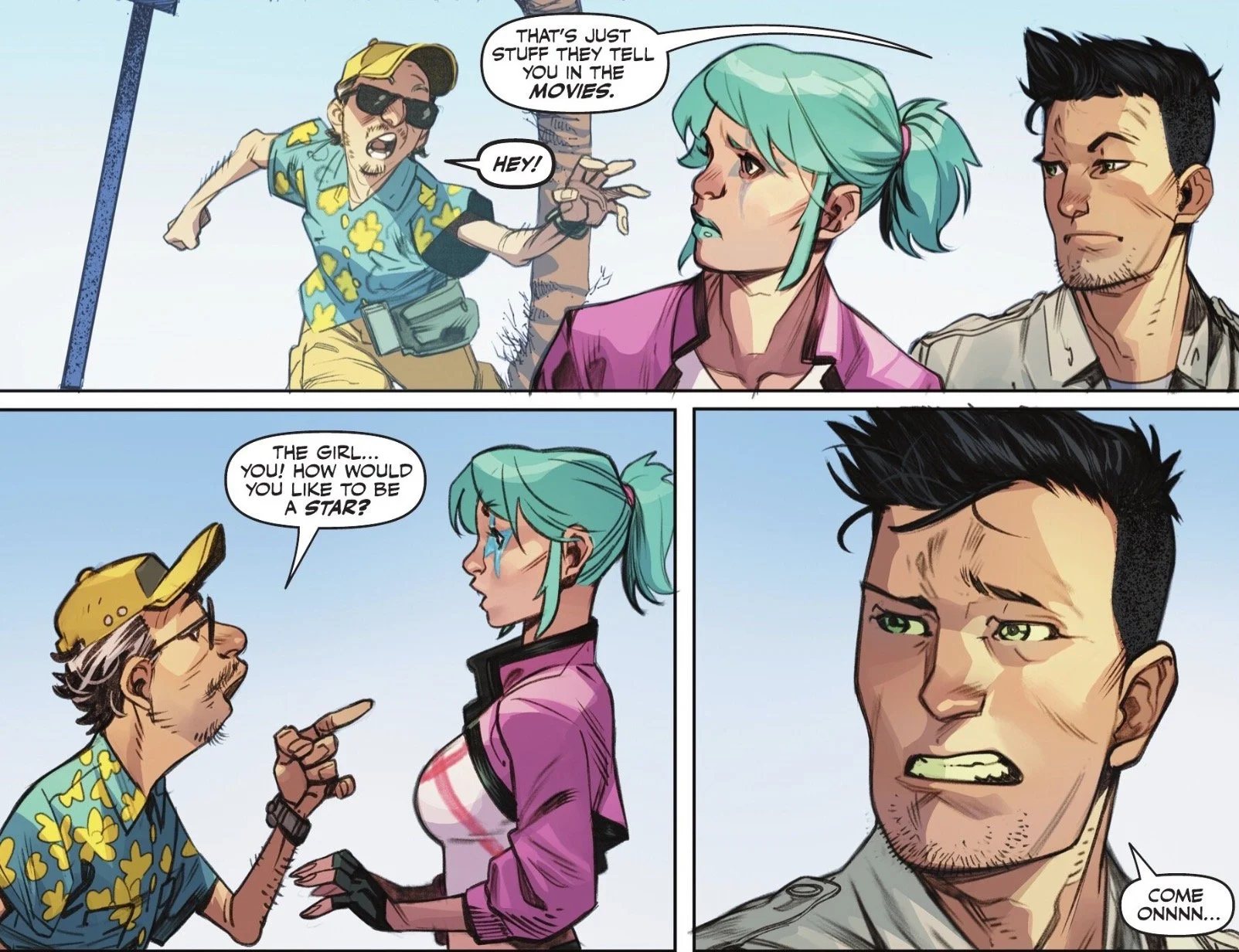 Meeting with the producer, he needs someone to take the place of his lead actress, who left to do a “big tentpole superhero movie” instead of his smaller arthouse film. He needs someone to replace her by tomorrow, or he’s ruined. After some shrewd negotiating by Odyssey, she and her “bodyguard” Kyle find themselves looking at a very sizable check, and Odyssey asks what time she should get there in the morning.