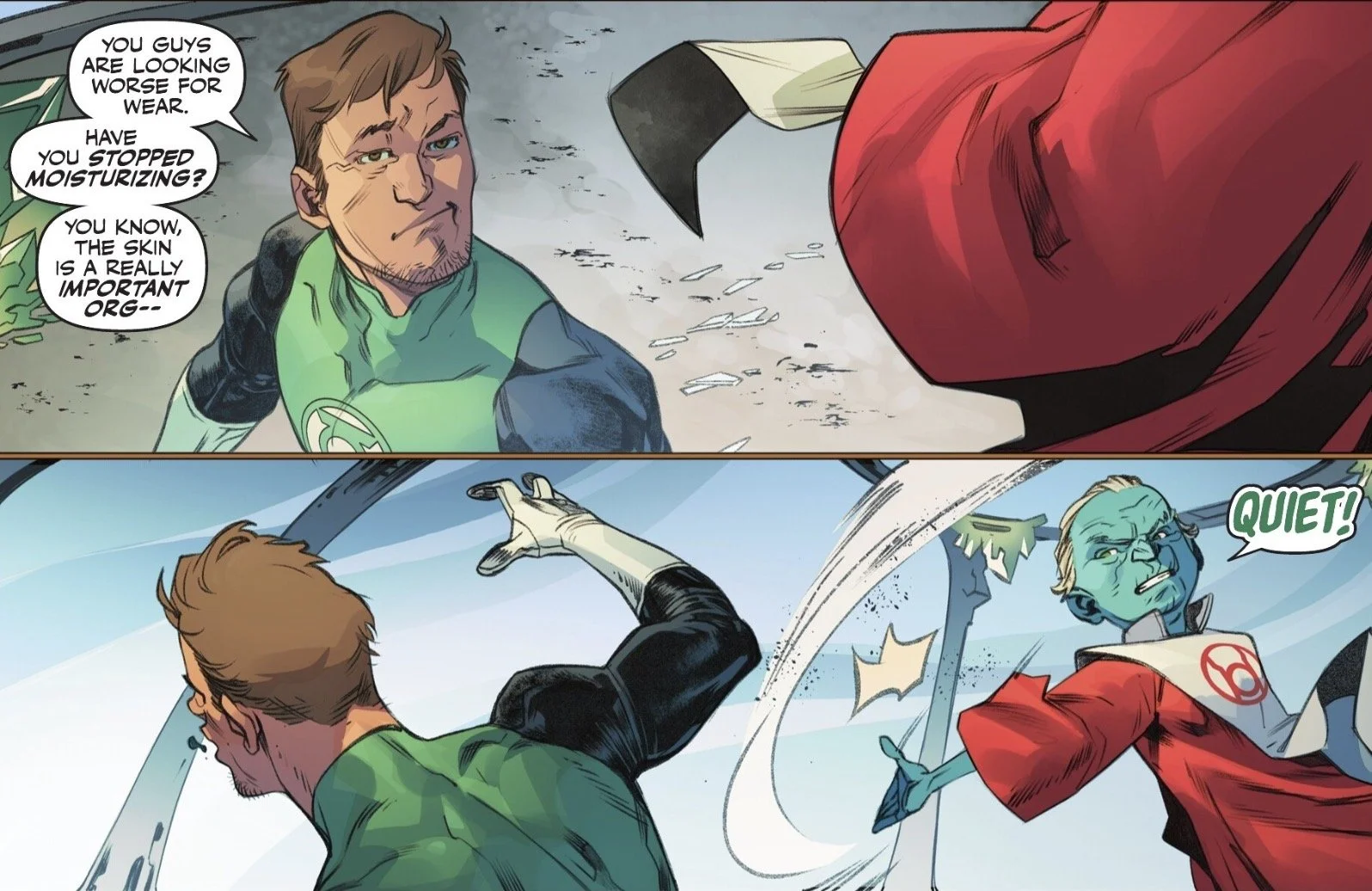 For the Hal half, Montos’s art doesn’t fare as well. Hal goes back and forth between looking like he should be Guy Gardner and looking like he’s been punched in the face too many times. At no point does he look like the traditional depiction of Hal Jordan. Similarly, the Guardians all look a little bit potato-faced. But that mostly makes them look like jerks, which they are, so it actually works.