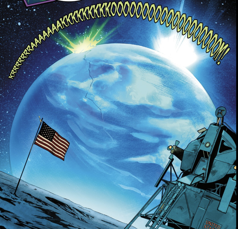 With one final scream of “HULK SMASH EVERYTHING!” a crack begins to split the Earth’s continental shelf. This is the moment I mentioned way back at the beginning of this review, and the splash page is gorgeous. We don’t see the Hulk; rather, we see a massive green explosion of light on Earth from the perspective of the Moon, complete with the lunar lander and the American flag. A crack begins to form as it crosses the middle of the planet. This scaled-back piece of art gives us a great perspective on how strong the Hulk has become. And the best part is: the issue isn’t over yet. His strength has not reached its limit. North’s narration, combined with the masterful artistic choices from Carratù and Blee, make this section of the issue one of the very best.