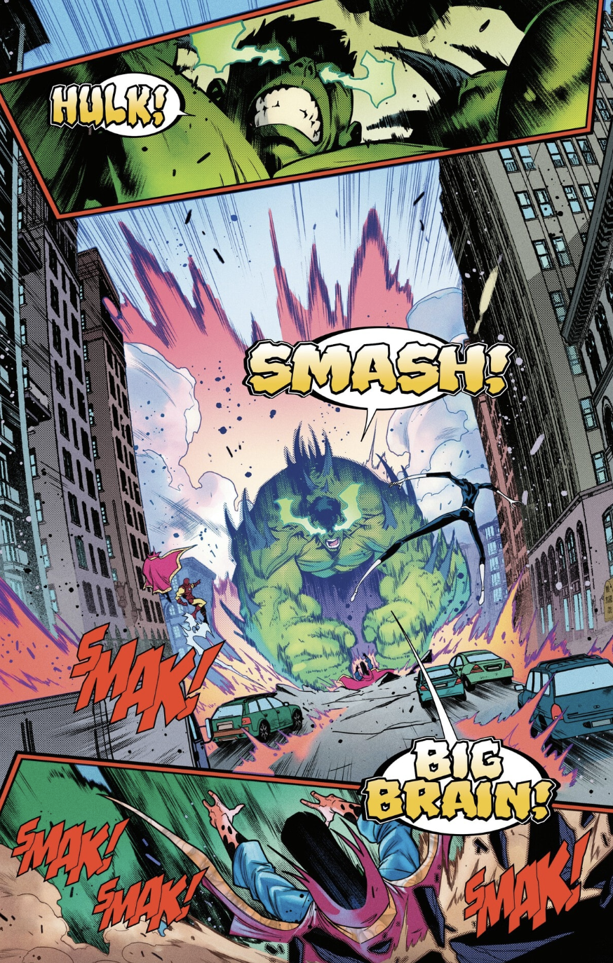 Hulk arrives on the scene in a three-panel splash page, screaming, “HULK! SMASH! BIG BRAIN!” as he slams into the heart of New York City, beginning his second rampage of the issue. Over the next few pages, Dr. Strange, Iron Man, Mr. Fantastic, and many other heroes of the Marvel Universe band together to try to stop the Hulk from causing city-shattering destruction. The combined might of the aforementioned trio, alongside Invisible Woman, The Thing, Spider-Man, Thor, and others, isn’t enough to push back the Hulk. The heroes quickly realize that this is the strongest version of the Hulk they’ve ever faced. Brute force isn’t going to cut it—they need a new plan…