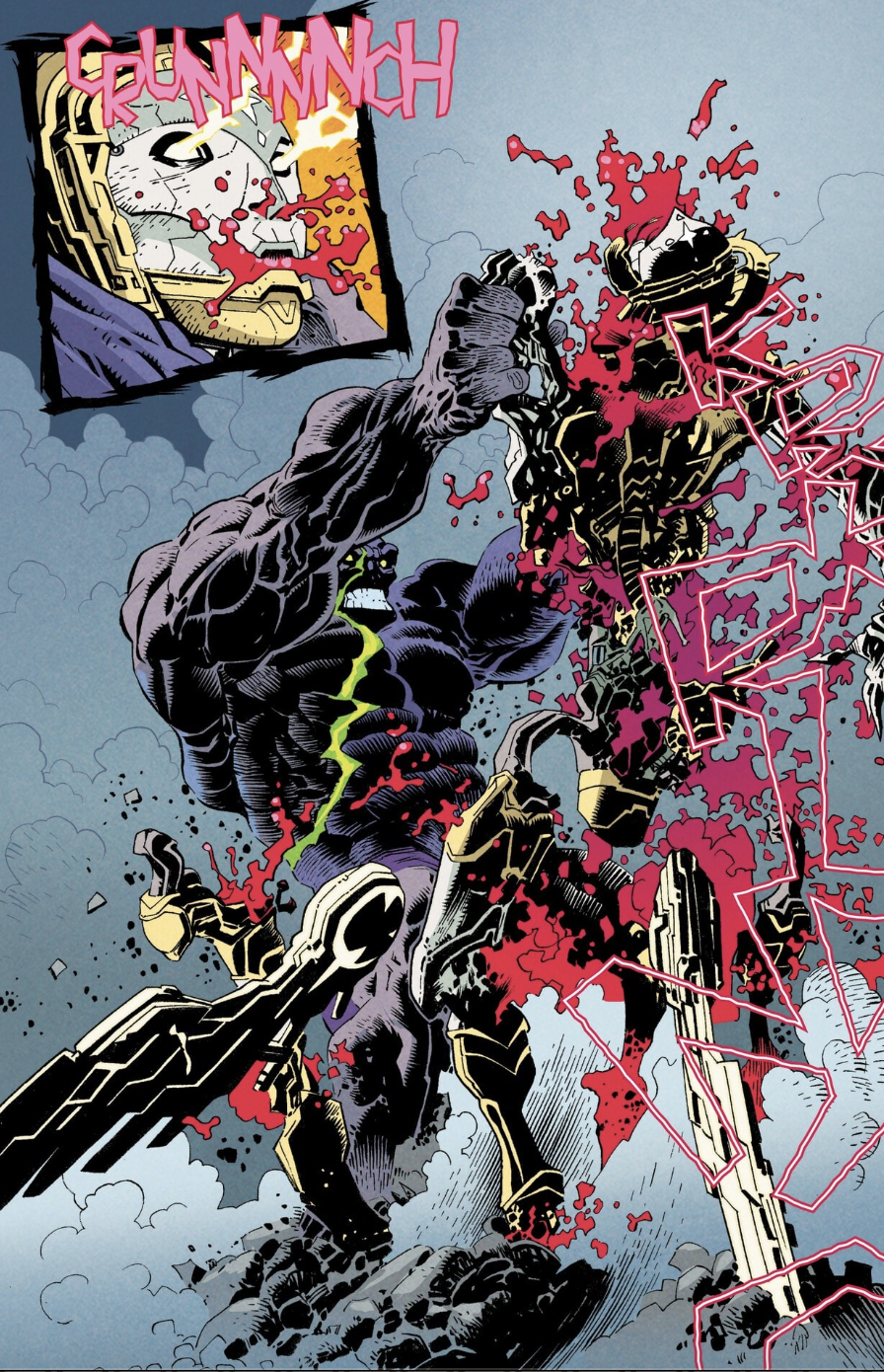 Over the next eight pages of the issue, Eldest/Hulk and the One Above All go to absolute war. This was one of the coolest battle scenes I’ve seen in a comic this year. The creative team went above and beyond on this fight and with the fight this issue has been promising, they 100% delivered. From the first punch that’s thrown, we quickly learn the strength that's being thrown away here. Eldest rips the One Above All’s spear out of her leg and jumps towards him; complete with disgusting bubbling skin from the force of the OAA’s light. Eldest is met with a titanic punch to the face that nearly obliterates her entire skull and shreds off all her skin.