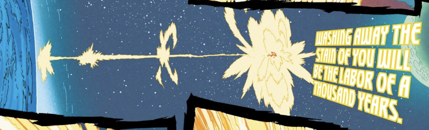 Eldest shoots down past the sea, and into the bedrock of the planet before jumping up in a fiery explosion. The force of Eldest’s jump takes the duo past the Earth’s atmosphere and slams them into the surface of the moon. The combination of the darkness of Eldest and bright shining light of the OAA as that battle has a striking ying yang feel to it. I’m not sure the art team made a concerted choice to do this during certain sections of the fight but there was something interesting I noticed. They sometimes choose to not show so much specific detail in the figures but they give enough of an outline as if they are almost the embodiment of good and evil. I might be looking too deep into things but I wanted to note this for sure.
