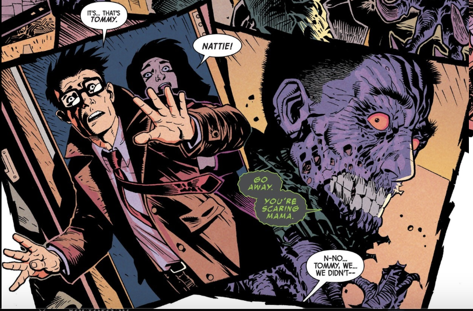 In our final act, we head back to Indiana and into the kitchen with Bruce and Betty Banner. It’s the evening after the funeral. Betty tells Bruce that the coffin was empty this morning, the “Hulk” turned everything at the military base to dust. Bruce continues to say that they’re safe where they are since they have nothing the Hulk wants and Betty just gives him this disgusted look. It’s clear what she thinks of him at this point in time. Betty tells Bruce she’s going to check on Nattie, the mother of the deceased soldier and Bruce begrudgingly comes along. When the pair get to Nattie’s place they find a monsterized version of Tommy terrorizing his mother.