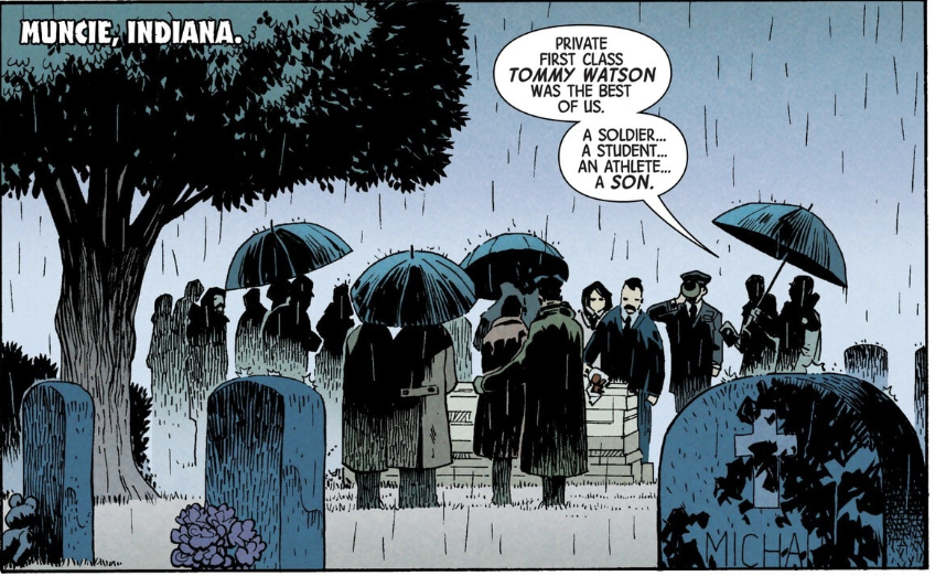 We open on a dark and dreary day in Muncie, Indiana; current home of Bruce and Betty Banner. Picking up from the end of the series third issue, we now see yet another of the countless tragedies that have occurred since Eldest took over the body of the Hulk. Bruce and Betty attend the funeral for Tommy Watson, a son of one of their co-workers. The effects of Eldest’s rampage are now being felt by mothers, fathers and families like Tommy’s all over the country. It's a stark reminder for Bruce and Betty that the quiet, normal life they are trying to live might not last much longer. People are dying and it's only going to get worse.