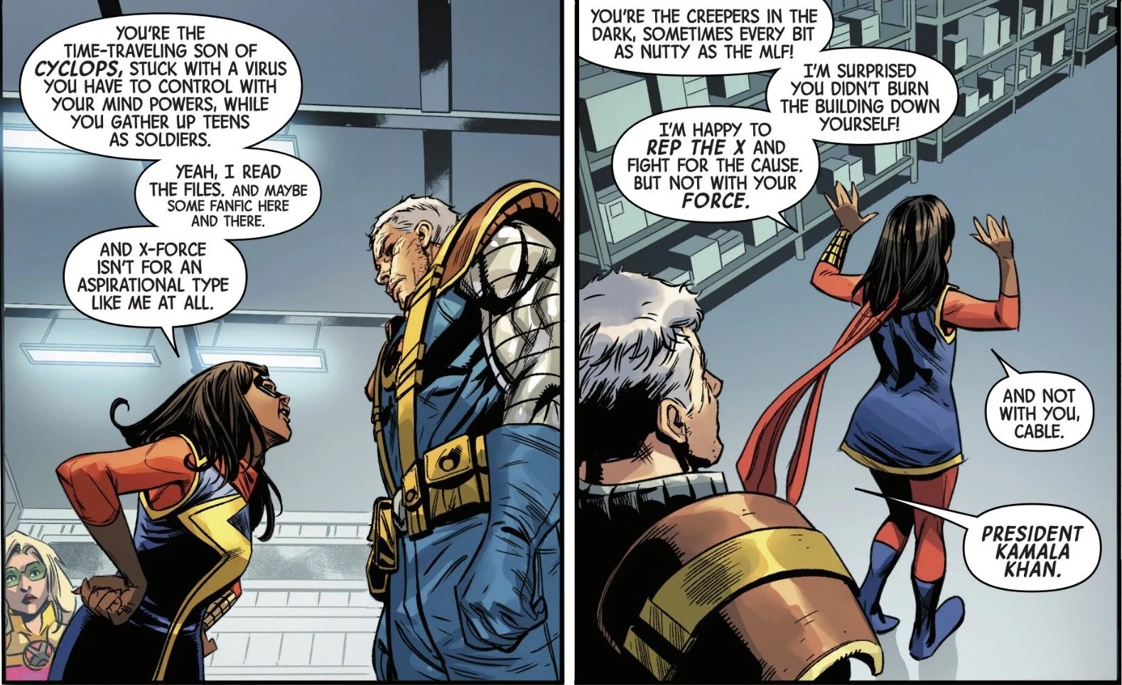 The idea of Ms. Marvel, Kamala Khan, being the first mutant president in the future is an interesting one. She is such a strong character, although personally I am not a big fan of her suddenly being a mutant in addition to being an Inhuman. But that is the price we pay for movie synergy. I know all these futures that Cable sees or comes from are all only possible ones and that the future is not set in stone, but I would be very interested to see how this particular one plays out.