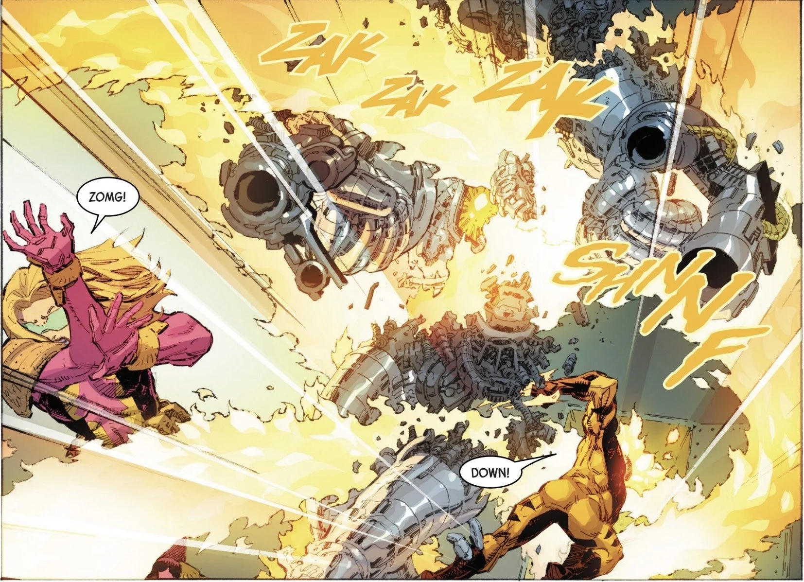 The artist may be different, but colorist Romulo Fajardo Jr. is still with us, so that helps give the book a more consistent visual style. He still handles explosions well, and there are several of those this issue. And the images of Archangel changing are particularly effective. Maybe he’s not super flashy, but his work is solid and consistent.