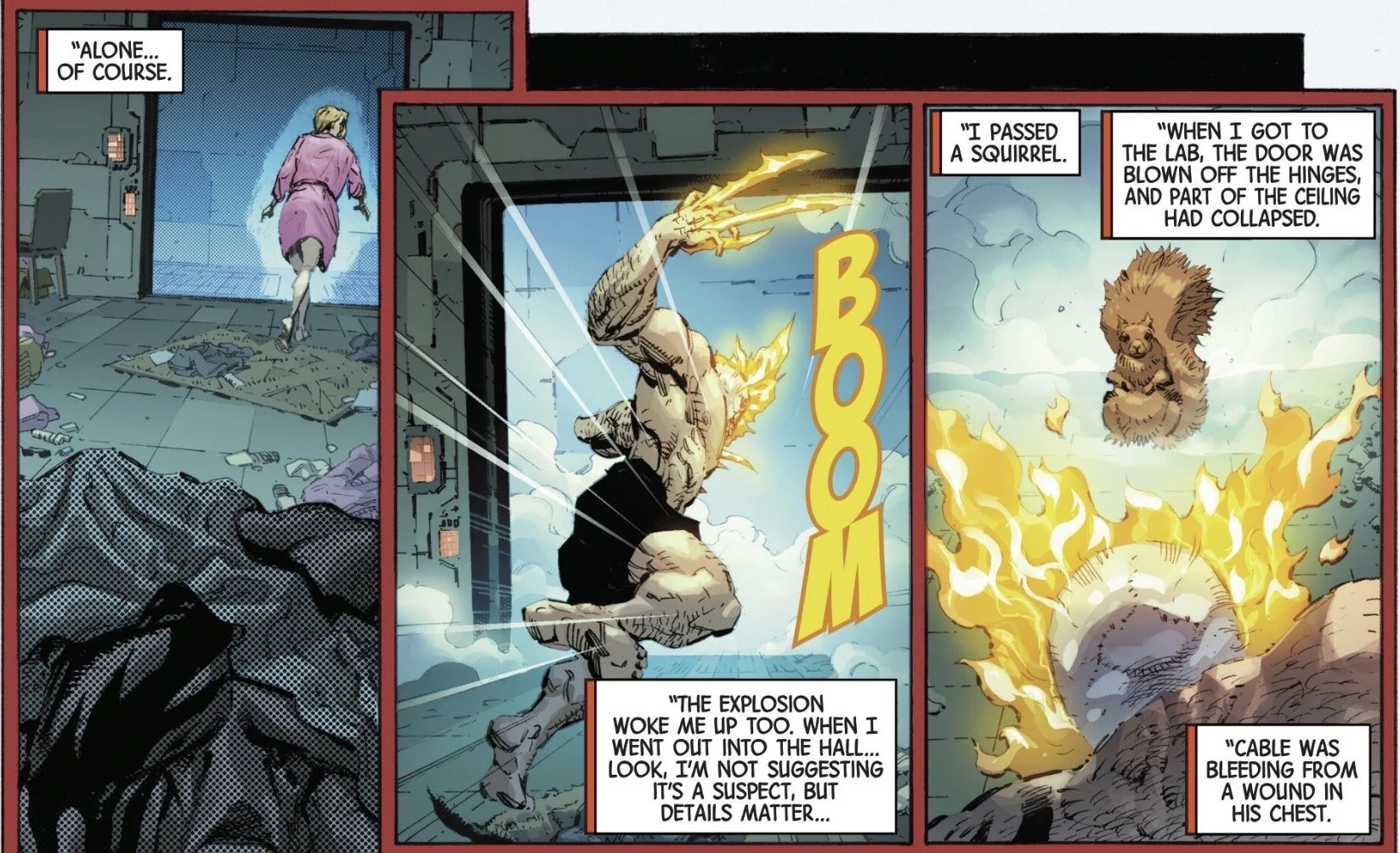 We pick up in the aftermath as the team tries to figure out what happened. Kamala Khan, aka Ms. Marvel, had fallen asleep in the TV room when she heard the explosion. Akhiro, aka Hellverine, had been in his room, and he passed a squirrel as he raced toward the explosion. He doubts the squirrel is a suspect, but details matter. Warren Worthington, aka Archangel, had been having dinner with Maxine Danger of the Beyond Corporation when he decided that he needed to talk to Boom-Boom. When he got there, Cable was seriously wounded, and Tabitha was near death. Warren slipped into his new Life form and apparently healed them.