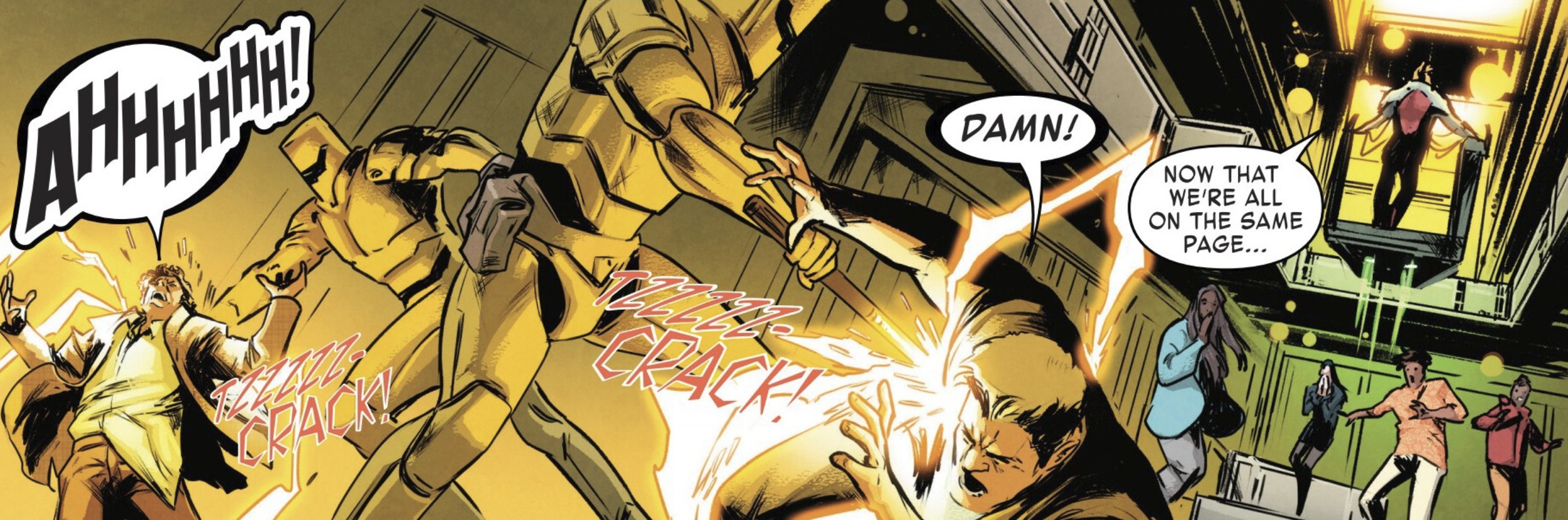 What was super interesting to me, was that Tony looks to have gained combat skills from Williamson. Tony can fight when he’s in his armour, but I’ve never really seen him in fisticuffs in hand-to-hand combat. Confronted by 4 massive dudes, I’m talking 4 guys straight out of the Chicago Bears 1985 defensive line, to my delightful surprise, he takes them out, 4 on 1. It was really cool to see, and I hope Williamson explains how Tony trained for that in the following Iron Man issues.