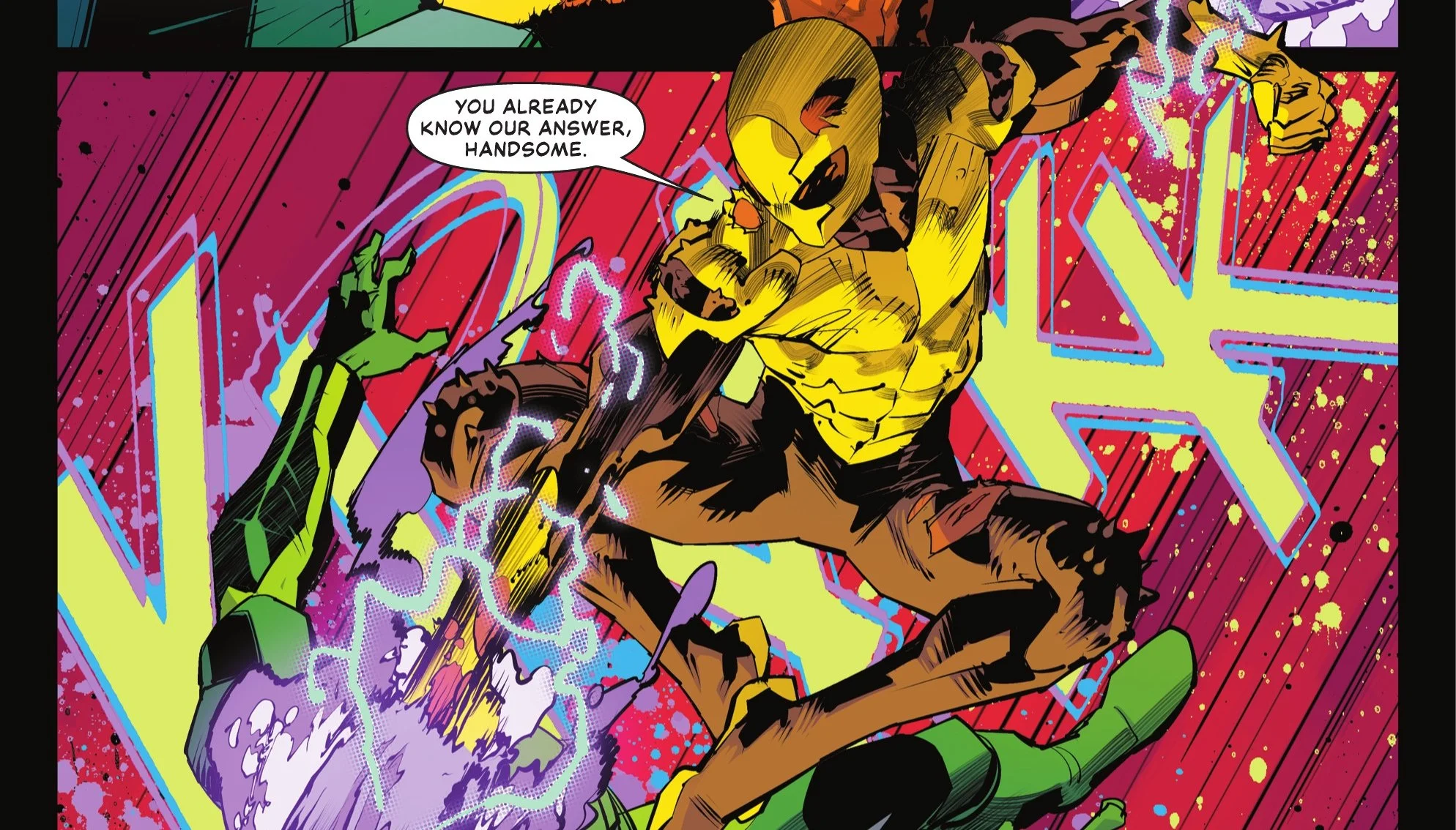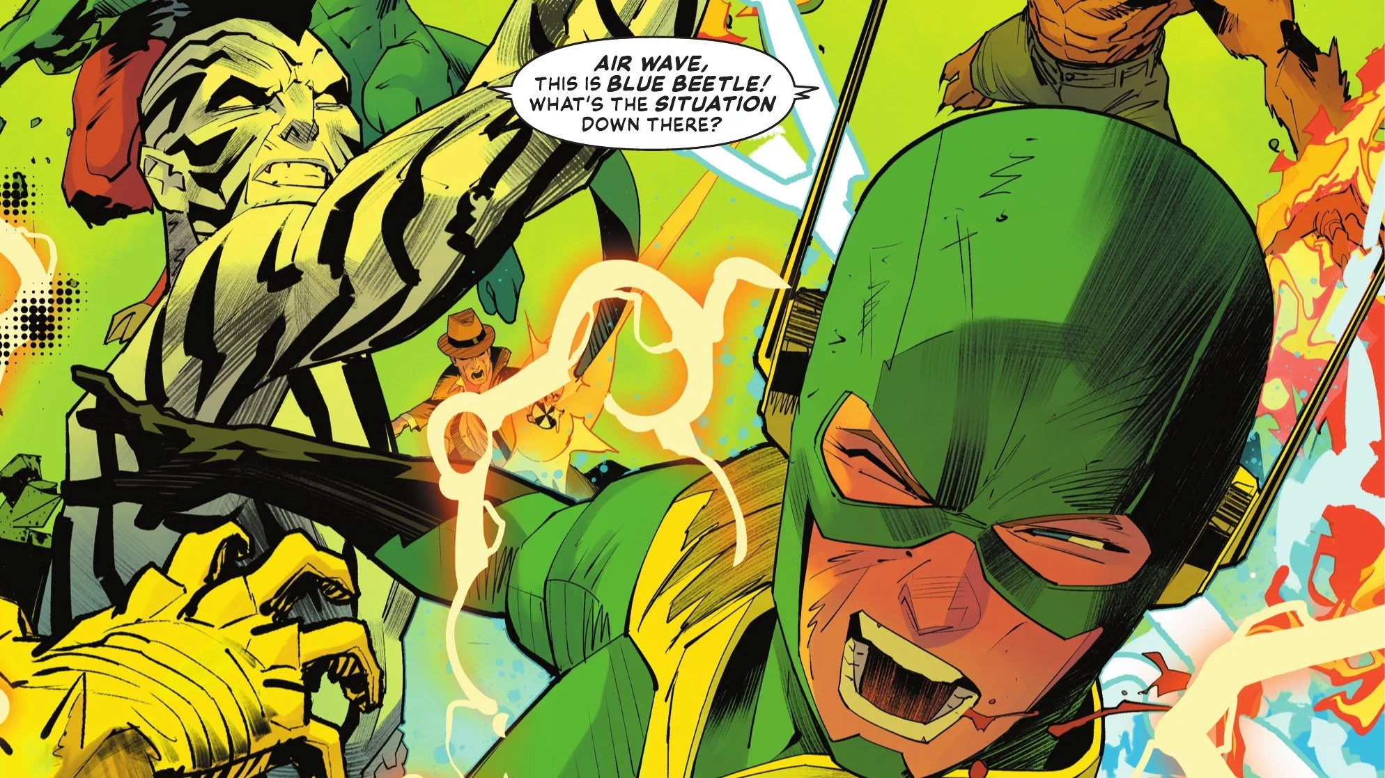 Air Wave is getting BEATEN DOWN. Blue Beetle is trying to get this team together but it's to no success. Everything they do is matched by all the overpowered villains. He just hopes to God that Mr. Terrific can stop Neron in hell so that they can finish their job on Earth.