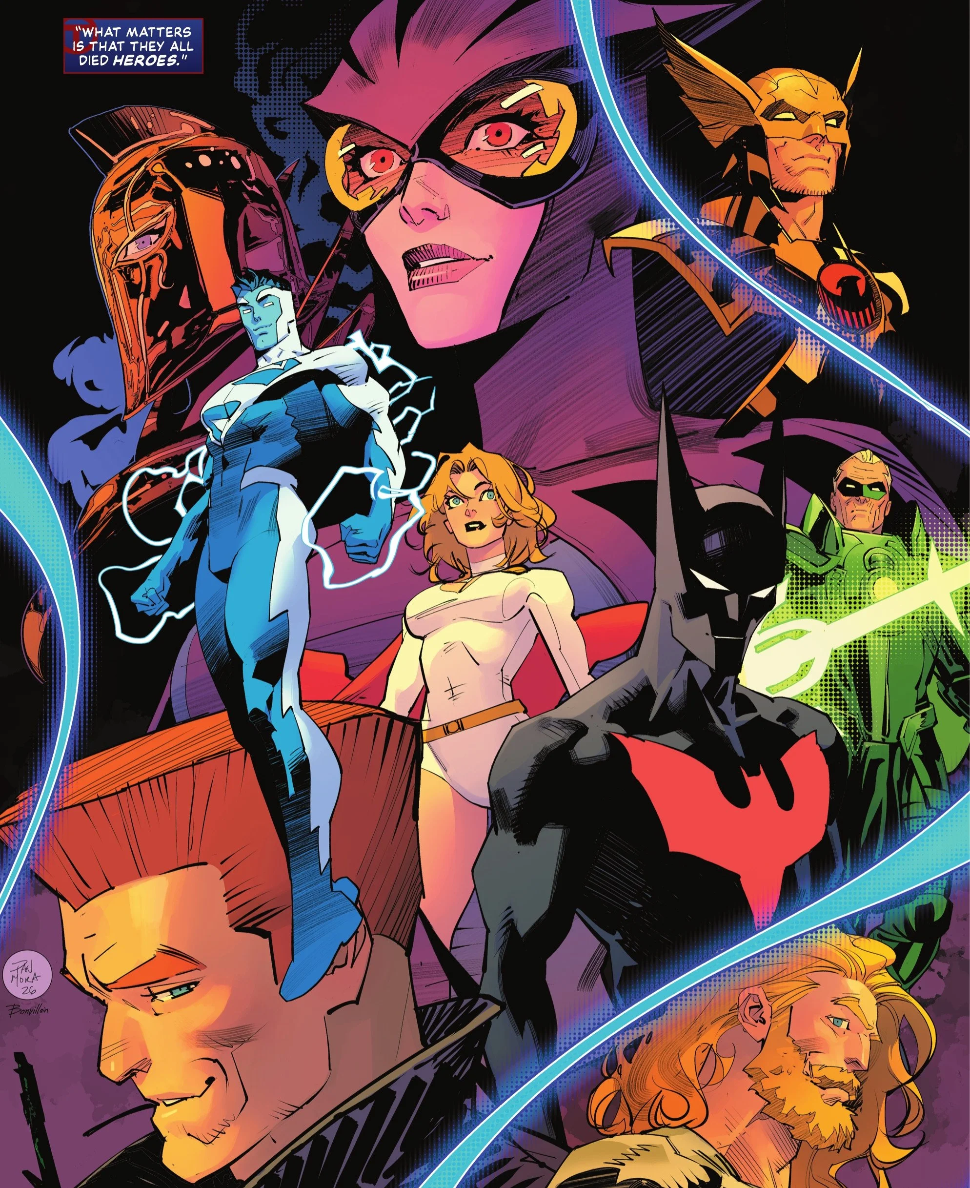 Where to begin? Well, let's start with the team. Casting a group of all-star characters and giving them one last heroic death, I think was a lot of fun. It gave the readers a chance to get one more moment with electric Superman, or hook hand Aquaman where they could die a heroes death during an important fight to save the world from Neron. The last page was a great ending and showed proper respect to the heroes lost along this journey.