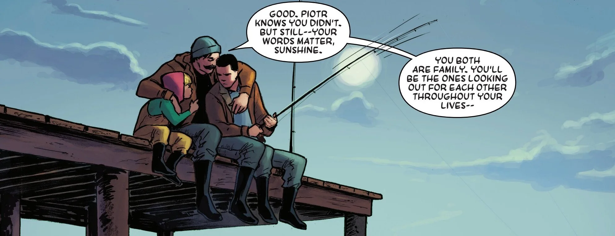 Back at Lake Baikal, Russia Colossus and Magik are fishing with their father. In Magik's frustration of Colossus not letting her fish yet, she says that she hates him. Leaving Colossus heartbroken by her comment. Showing the softness of his character.