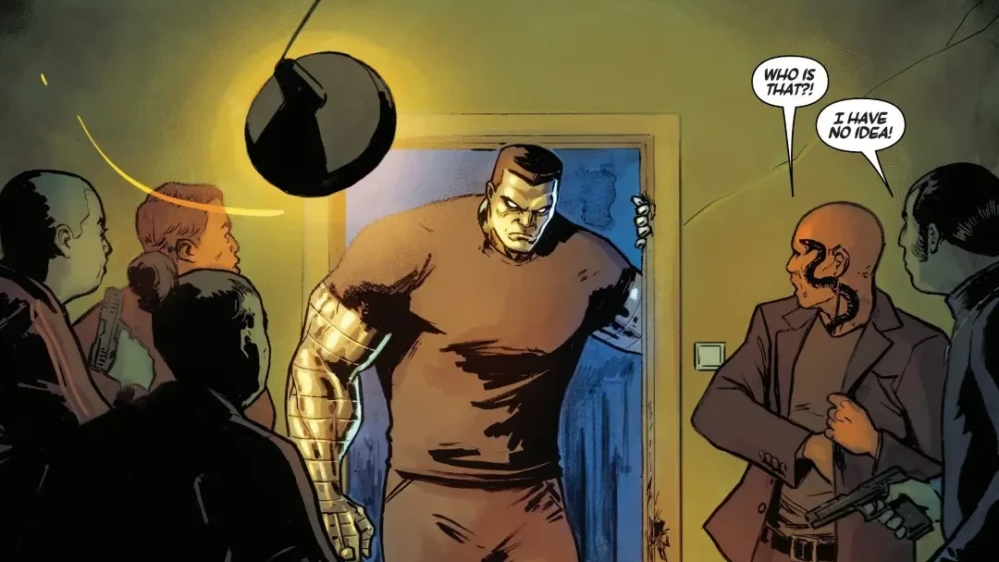Colossus is doing everything he can while his sister fights, going all around Russia to find clues about where she is. This leads him to The Lucky Bear bar, where he’s trying to find a man named Lev. The bartender directs him to the back room, where people are playing a card game with several other individuals. Colossus thanks them, takes the rest of his drink in one gulp, and heads into the back room, armored up.