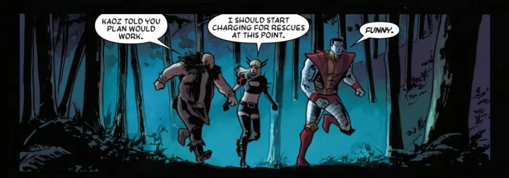 They arrive in the forest as Colossus reminds Illyana of her relationship with their mother that she may not remember. The closeness they had and the fact that her mother is the reason that Illyana even knows how to fight in general. Colossus is upset that Illyana forgets this part of her childhood. But she smiles at him and thanks him for describing it to her again.
