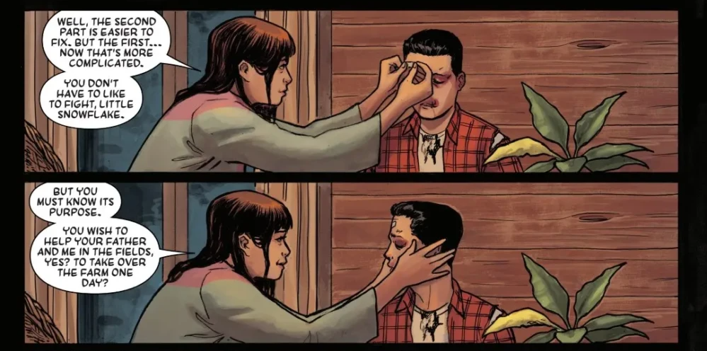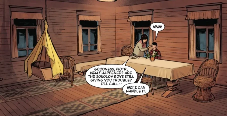 Piotr comes home beaten, bloodied, and bruised. The Sokolov Boys are giving him a hard time again. His mother, ever so loving, cleans up his wounds and tries to ask him why he doesn't fight back. To which he responds in the most Colossus way, saying that he doesn't like to fight.