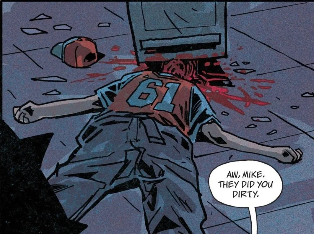 Even so, the issue makes good use of smaller character moments to maintain emotional continuity. Pretty Boy’s brief acknowledgment of Mike’s death is one of those moments. It’s quick, almost understated, but it carries weight because of what came before. Their earlier interactions gave that connection meaning, and this moment reinforces that even within all the violence, there are still traces of something human.