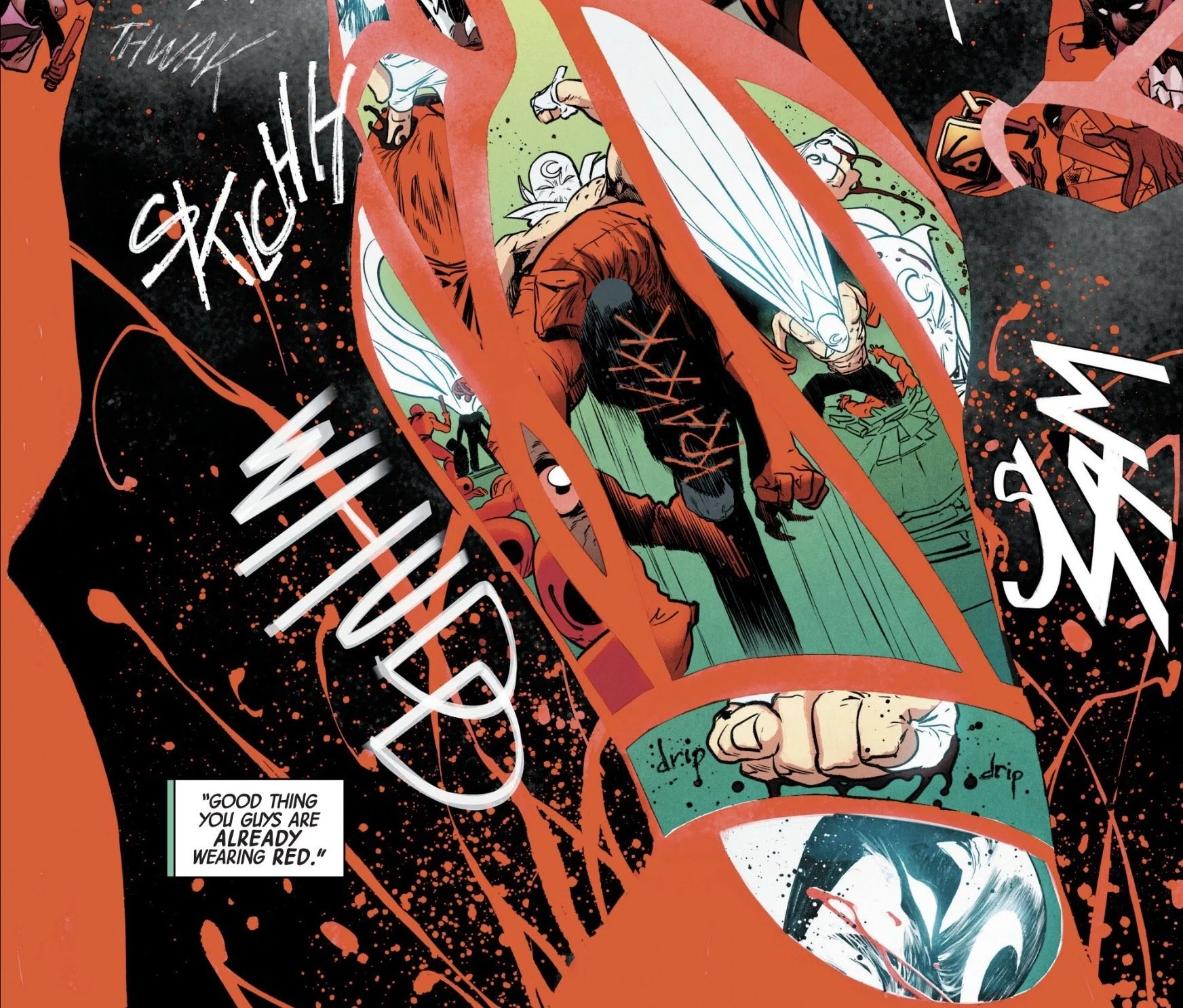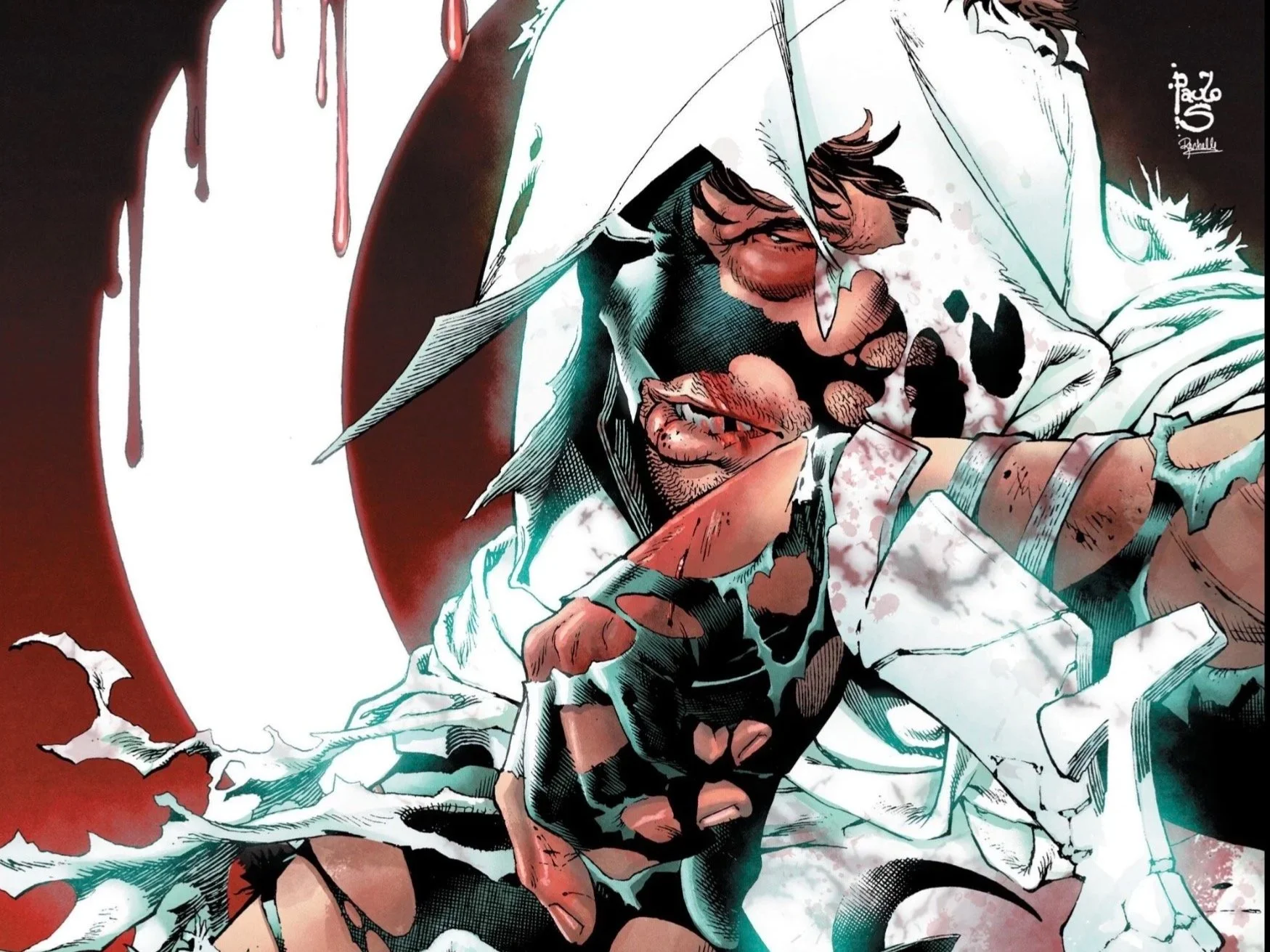Rachelle Rosenberg’s colors are such an important part of this title - the way the blacks of Zodiac stand out, and of course the glowing tone of Moon Knight’s white uniform. It’s even more striking when he’s just wearing the cape and cowl, the glow effect is even more pronounced them. And there’s certainly a lot of red in this issue too, which she makes stand out among the whites and blacks.