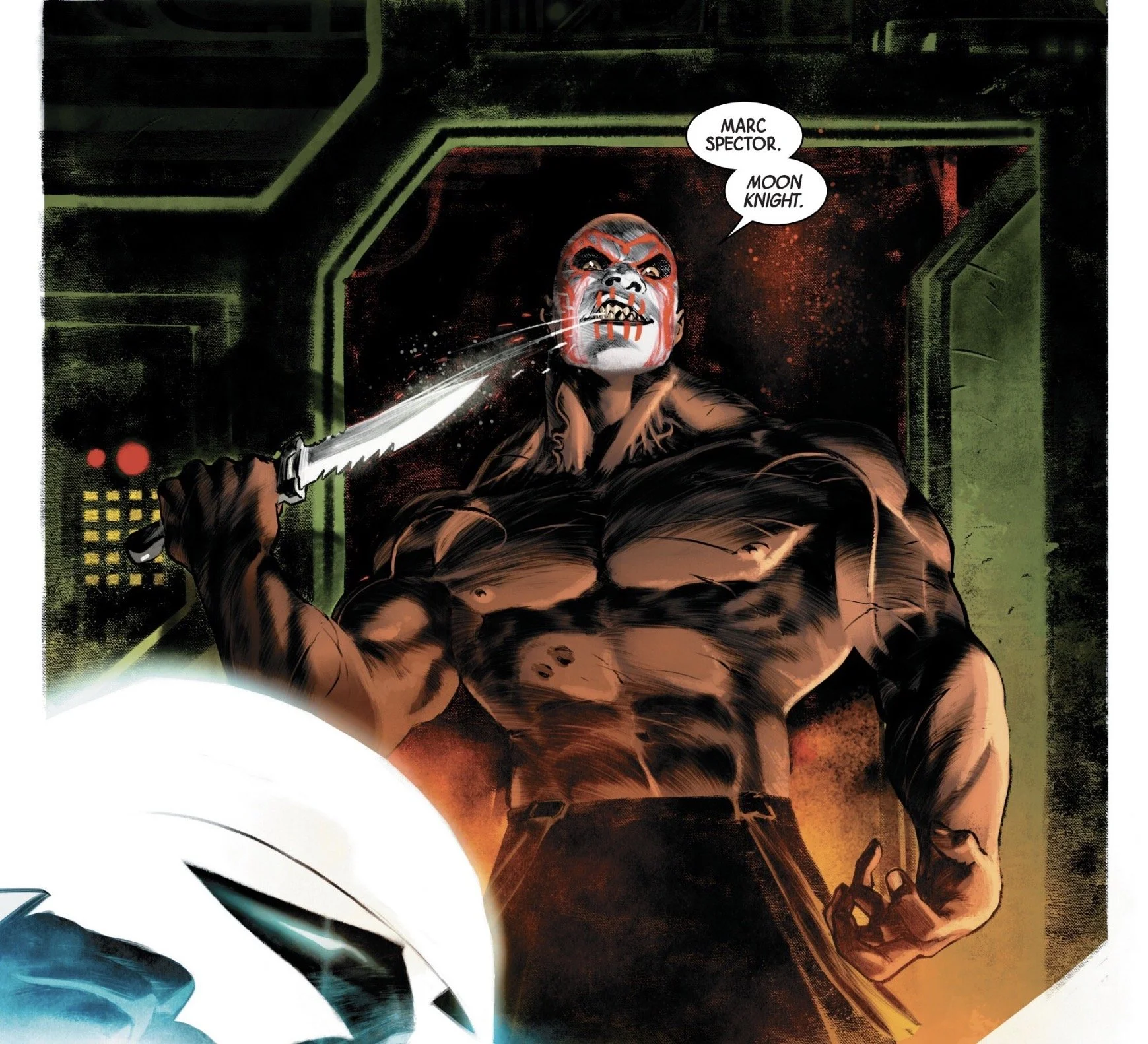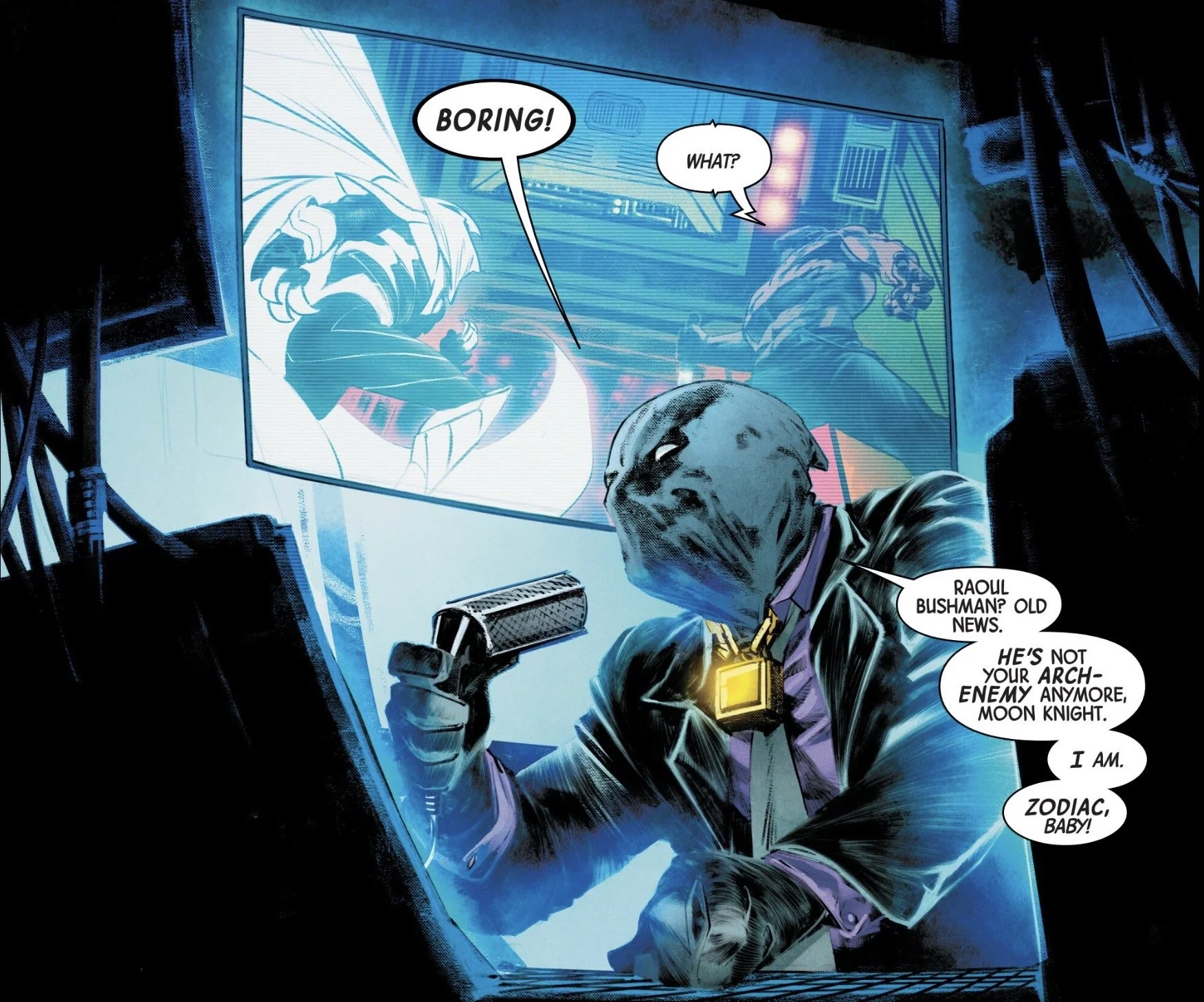 Meanwhile, Zodiac explains to Moon Knight that all he’s ever tried to do is to “help” him, to make him better. The Fist of Khonshu isn’t having it and tries to choke the life out of Zodiac as “thanks.” Maybe don’t put Marc Spector on your Christmas card list, folks. A well-placed explosion separates the two, and soon Marc only has eyes for Bushman. Zodiac finds their rivalry boring, so he pumps the room full of fear gas, hoping to “fully unleash” Moon Knight and goad him to cut Bushman’s face off again (like he did back in 2006).