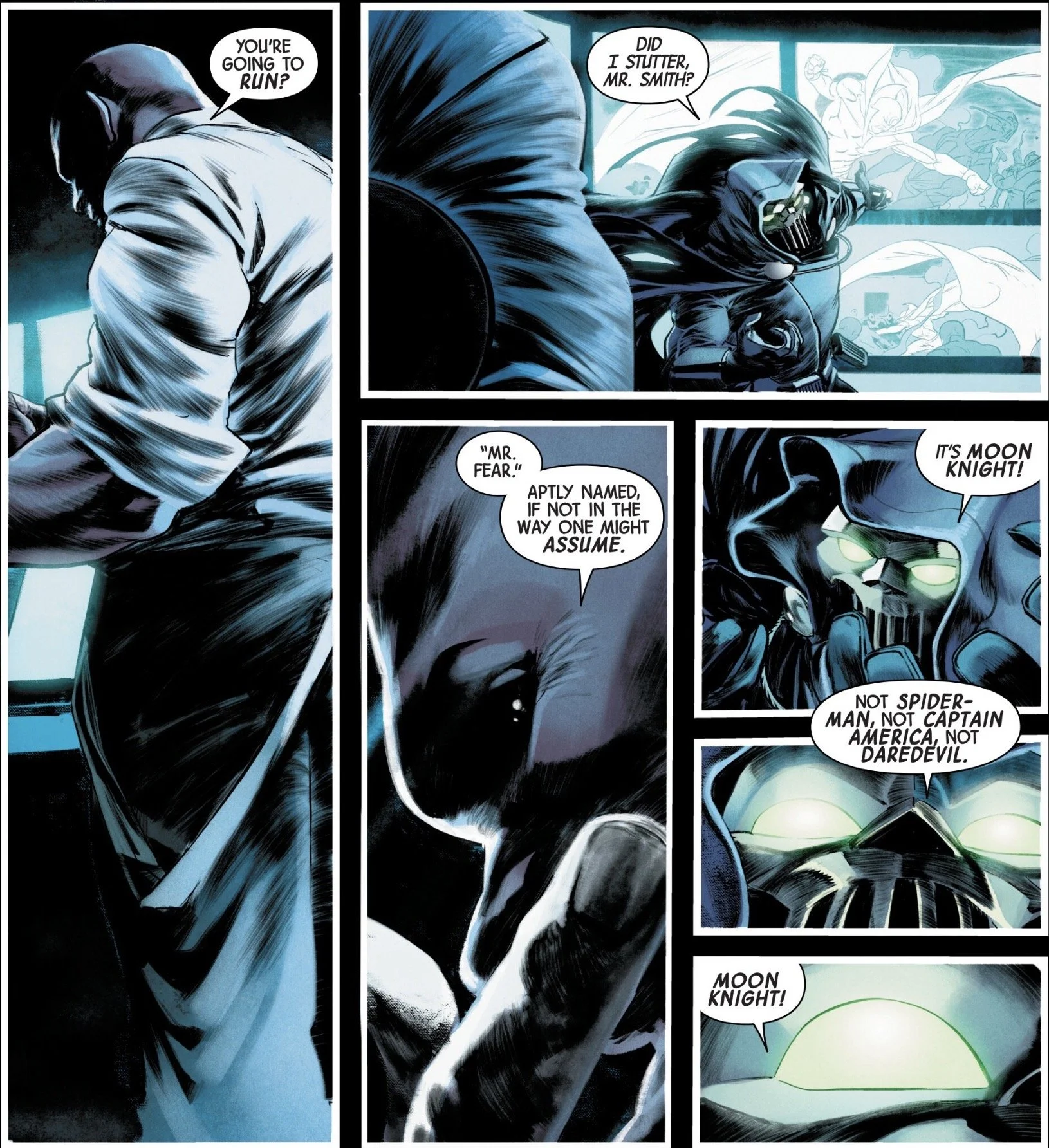 While Moon Knight and Zodiac fight their way out like the odd-couple duo that they are, Mr. Fear wants to get out of Dodge while he still can. After all, this isn’t Spider-Man, or Captain America, or even Daredevil - it’s Moon Knight! Even the craziest of the crazies know better than to mess with Moon Knight. Well, most of them…