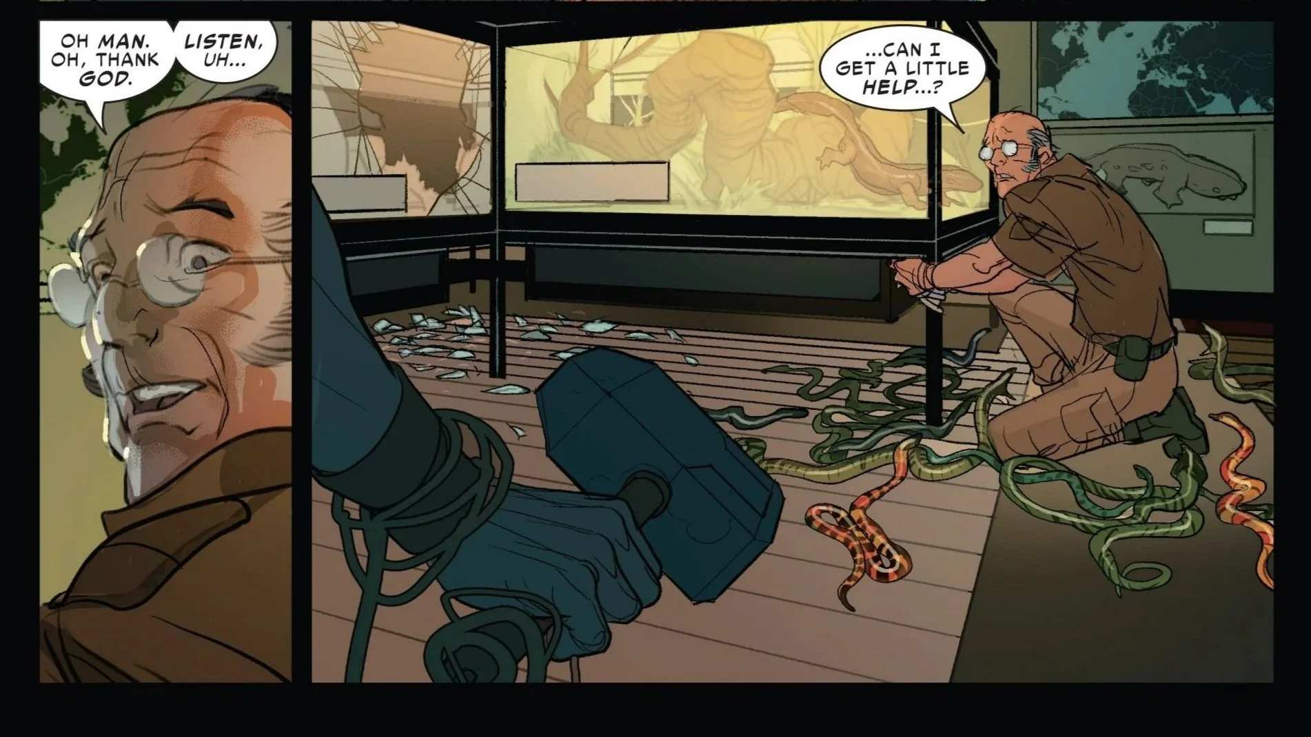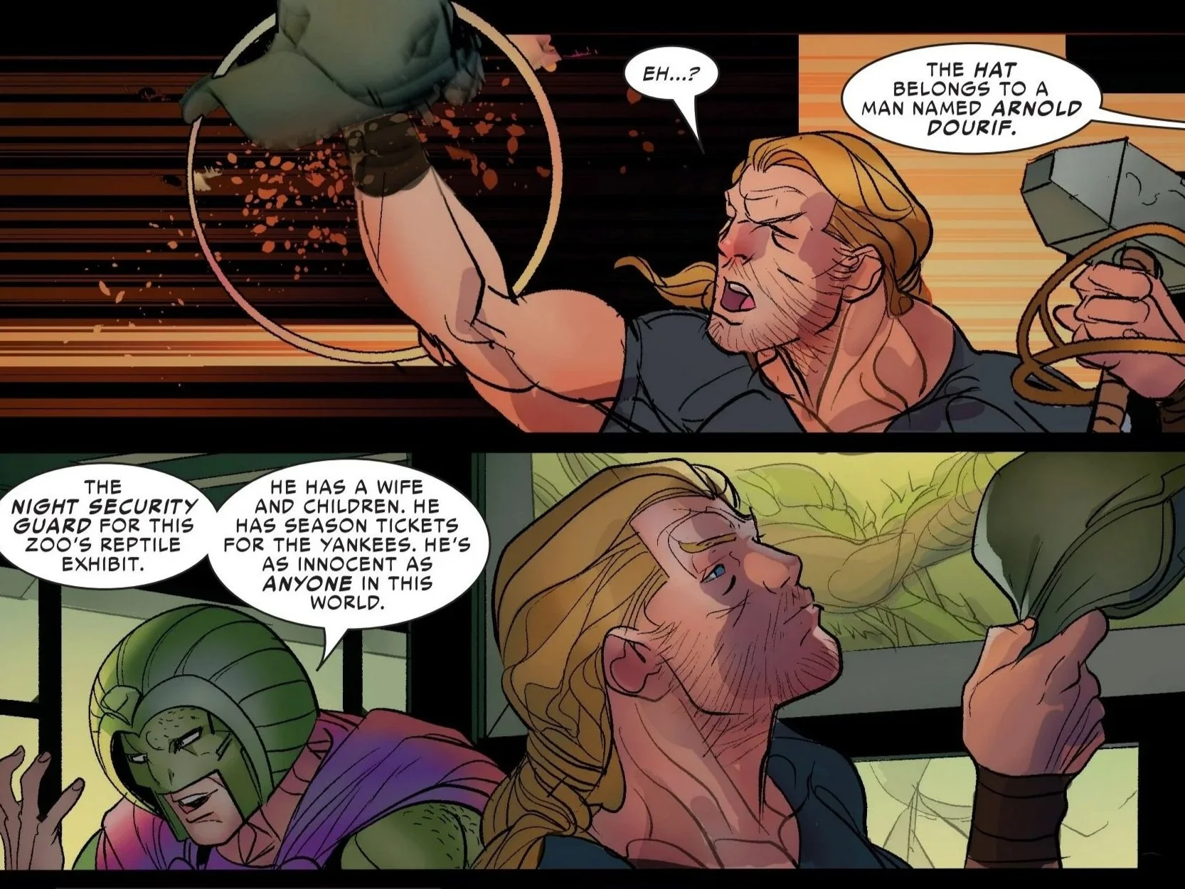 The Cobra explains the cap belongs to Arnold Dourif, the night security guard for the reptile exhibit of the zoo. He further details how he has a family and possesses season tickets for the Yankees, as innocent as anyone in this world. The Cobra had handcuffed him to a Hellbender Salamander exhibit (assuring Sigurd that the creature is harmless despite its name) and essentially tells Sigurd he has a choice here. He can assume the security guard will be entirely fine all on his own, or he can attempt to save him.