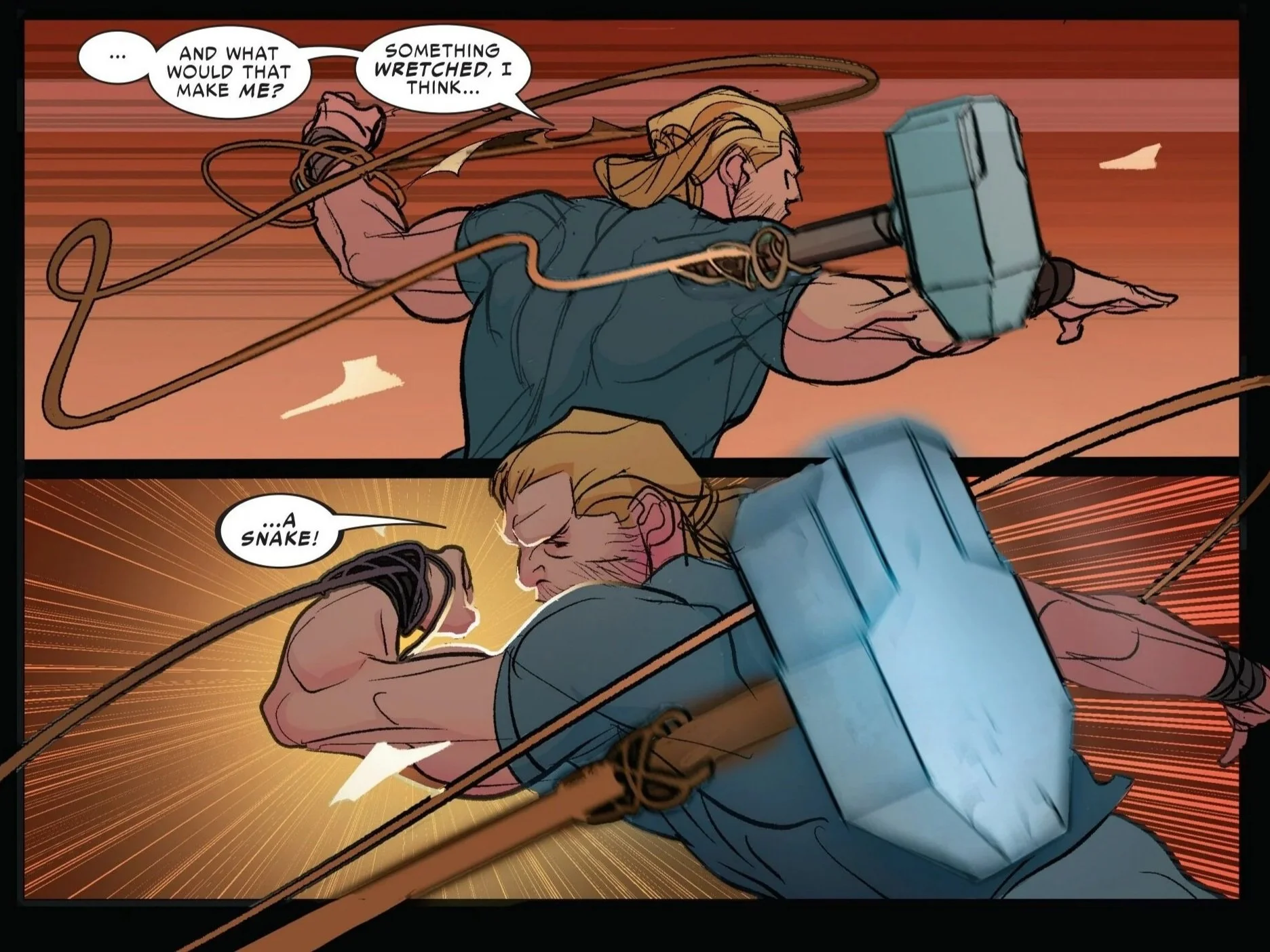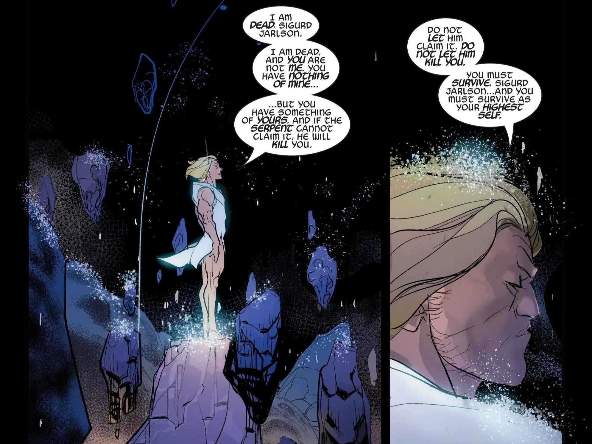 Thor then tells Sigurd that in order to survive, he must do so as his highest self. We can infer based on the previous issue of Mortal Thor, as well as the last time we saw Donald Blake or the Serpent in Immortal Thor, that what Thor is referring to is the soul of Sigurd.